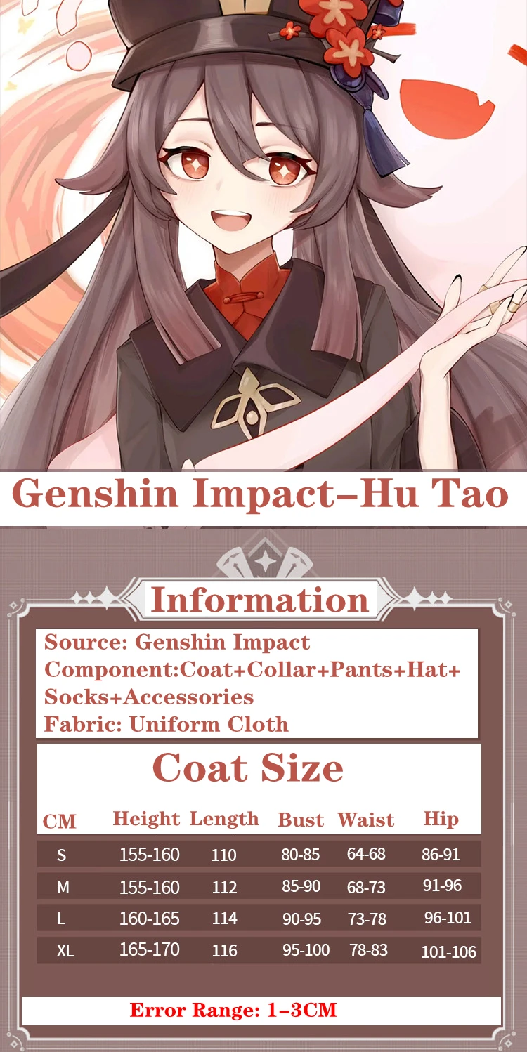 Название: костюм для косплея Project Hutao Источник: Genshin Impact Стиль: Аниме/игры Назначение: Косплей Аниме/женский костюм на Хэллоуин/рождественское карнавальное пальто для вечеринки Размер: S-XXL Материал: однотонная ткань. Компоненты: верхняя одежда, воротник. Штаны. Шляпа. Носок. Аксессуары. Пол: унисекс Подходит для взрослых Совершенно новый продукт Сделано в Китае