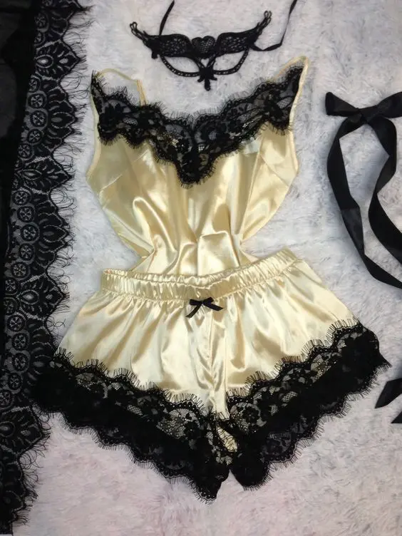 Женская пижама, Сексуальный Атласный пижамный комплект, Черная круж...