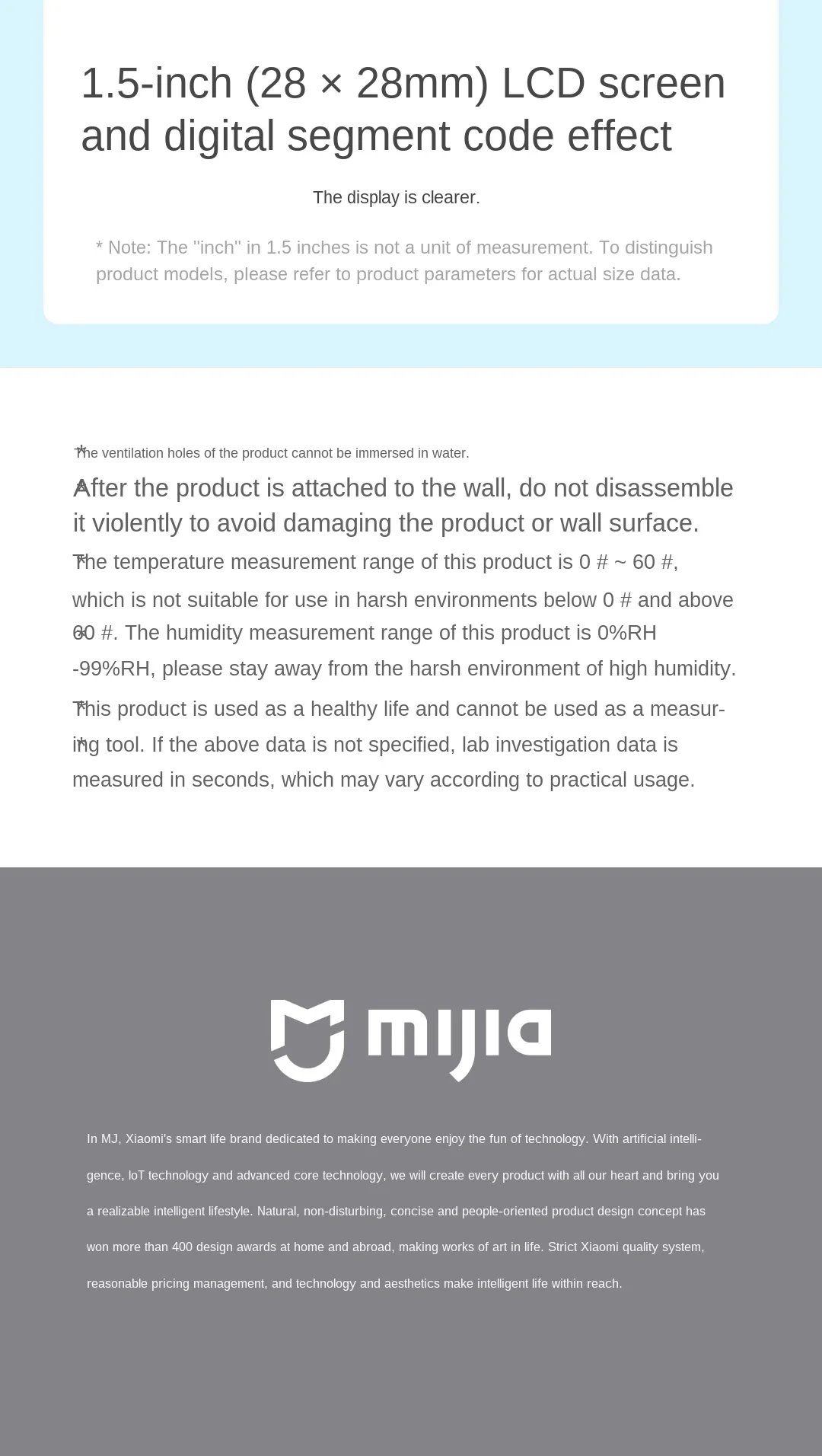 -- Домашний гигрометр, данные могут быть четко прочитаны с различной яркостью и углом. -- Высокая чувствительность и точный чувствительность из Швейцарии, чувство тонкой смены температуры и влажности дыхание. -Выразительность, подчеркивающая уровень комфорта, милая и простая. -Экран с низким потреблением, аккумулятор с кнопкой CR2032 в течение одного года. -- Встроенный Расширенная влажность датчик температуры и влажности, точность измерения температуры: 0,1 градусов, влажность точность: 0,1 относительной влажности -Через приложение Mi, чтобы включить hu mi difier, когда внутренняя hu mi dity слишком низкая, и кондиционер, когда температура в помещении слишком высока СВЕТОДИОДНЫЙ цифровой дисплей, вы можете легко получить температуру, влажность