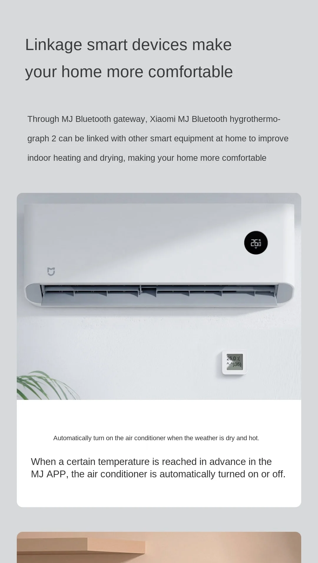 Может быть установлен заранее в приложении Mijia, автоматическое включение или выключение связанных устройств при достижении определенной температуры