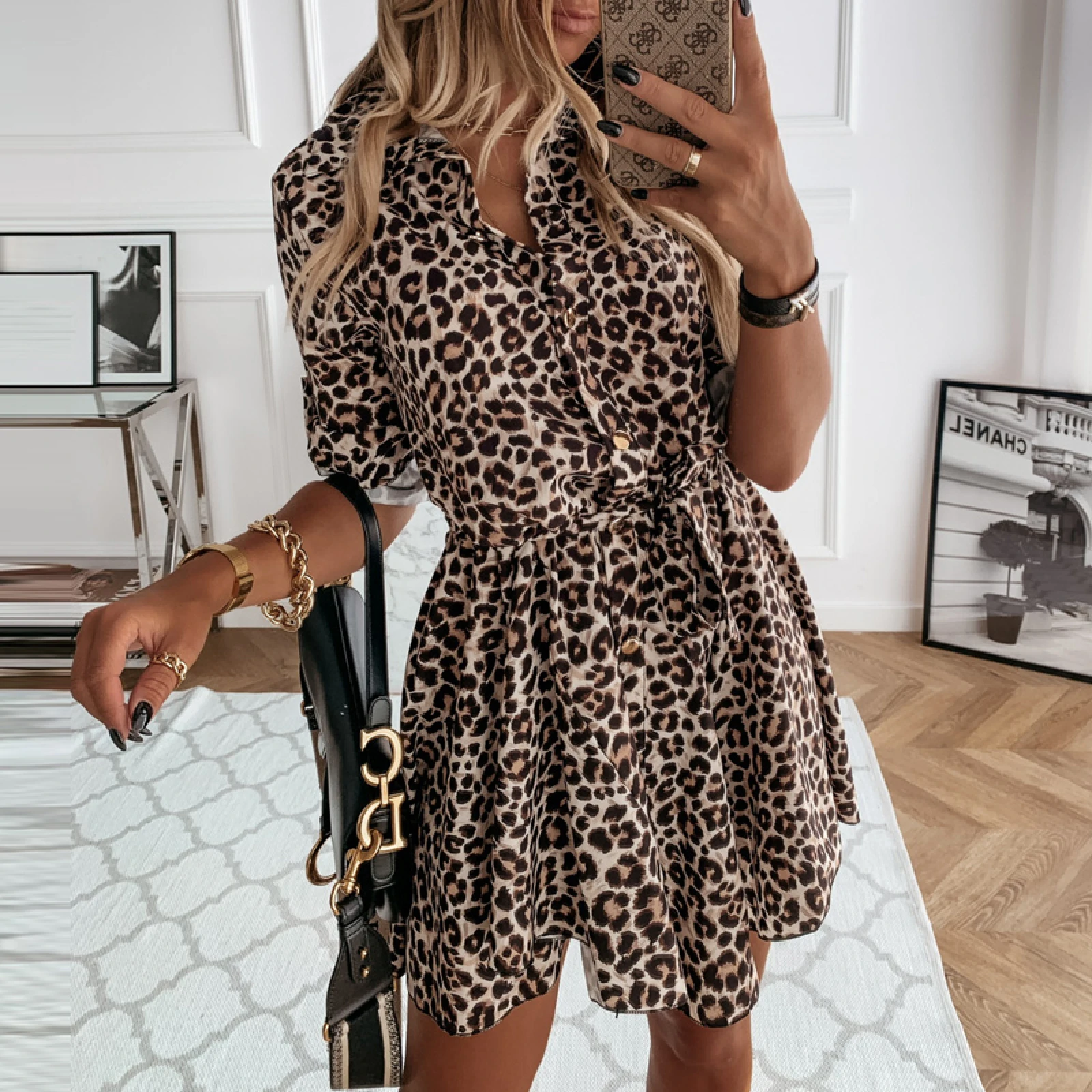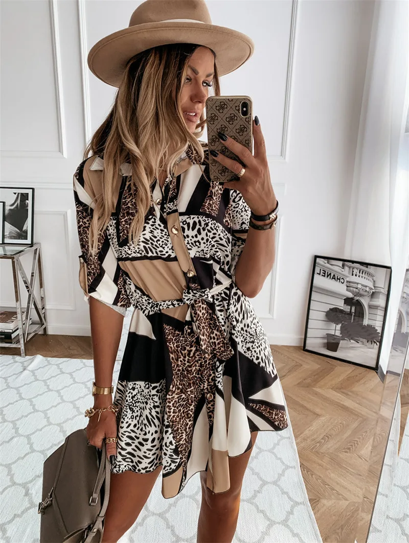 Женское леопардовое платье-рубашка, мини-платье с длинным рукавом, отложным воротником и поясом, сексуальное женское платье на одной пуговице
