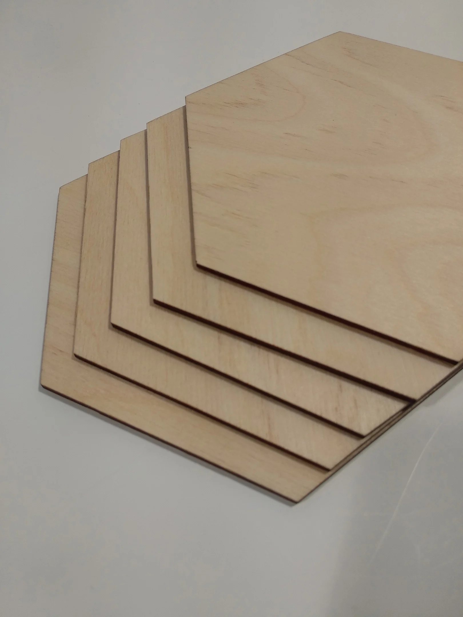 В данном наборе 3 шестиугольных заготовки размером 200х173мм. Они выполнены из берёзовой фанеры ФК сорт 2/2 и имеют толщину 3мм. Элементы прочные, но лёгкие и могут использоваться в дизайне интерьеров, оформлении свадеб и праздников, в самых разнообразных творческих проектах.