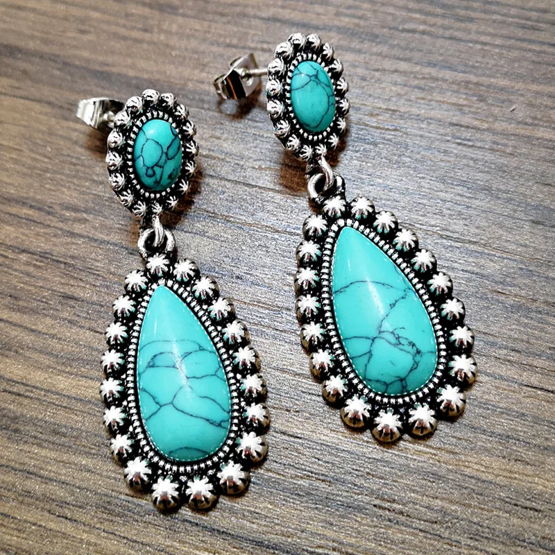 Модные Винтажные Тибетский натуральная бирюза серьги синий камень капли воды длинные висячие серьги для женщин Boho ювелирные изделия 2021
