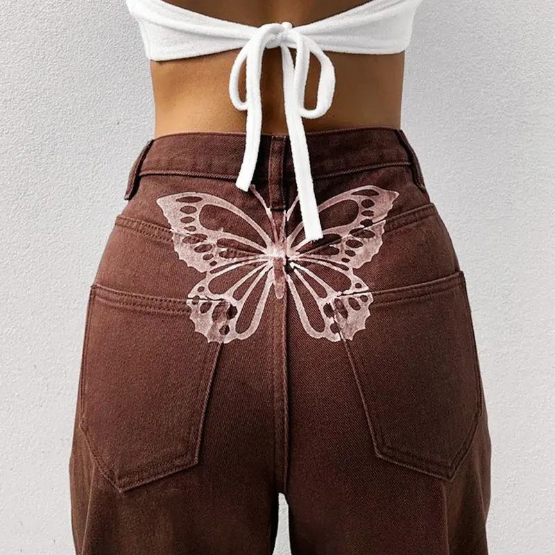Прямые джинсы с принтом бабочки сзади, женские повседневные брюки с...