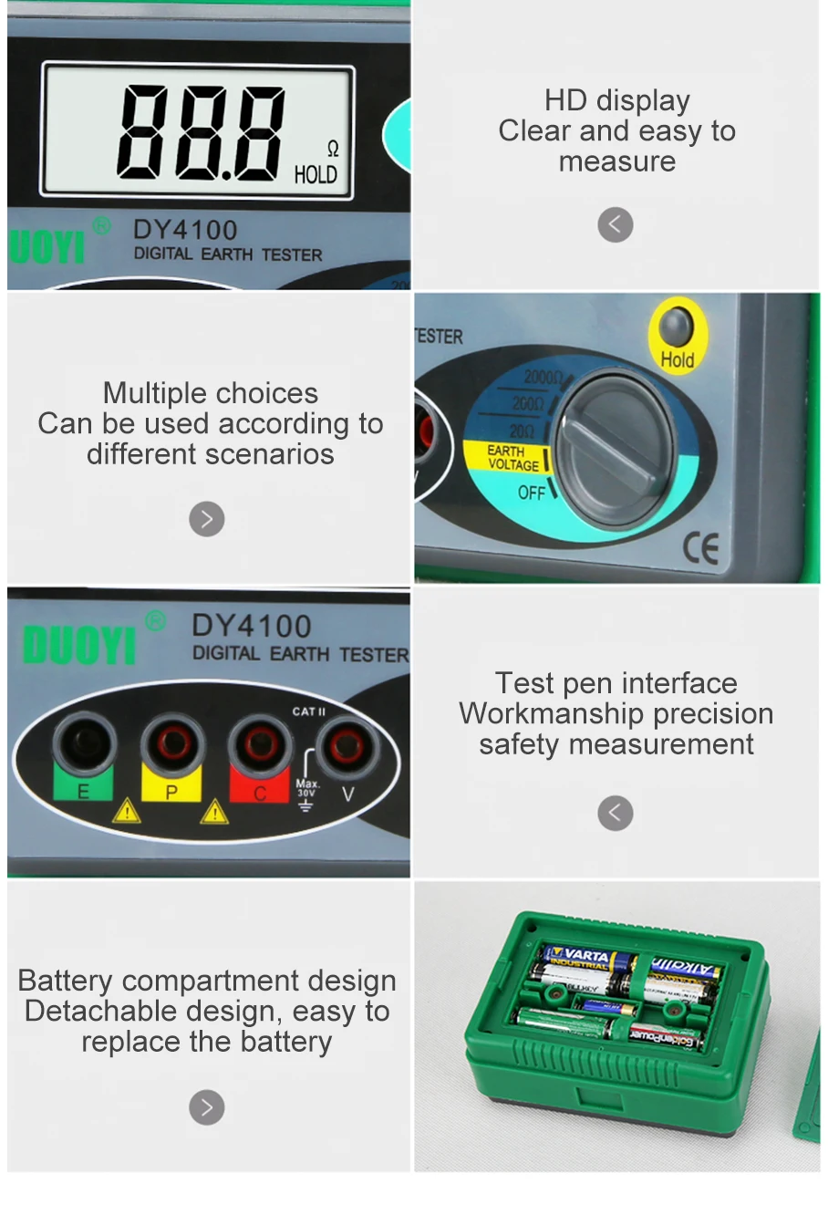 Цифровой тестер сопротивления земли DY4100-это тестер нового поколения для практики электрика, разработанный DUOYI в последние годы. Схема, структура и техника традиционного тестера сопротивления земли были улучшены, и новый дизайн красивый и практичный. Этот имеет более полные функции, более высокую точность, более удобный и надежный для работы и больше подходит для использования на открытом воздухе с пылью и влажной структурой.