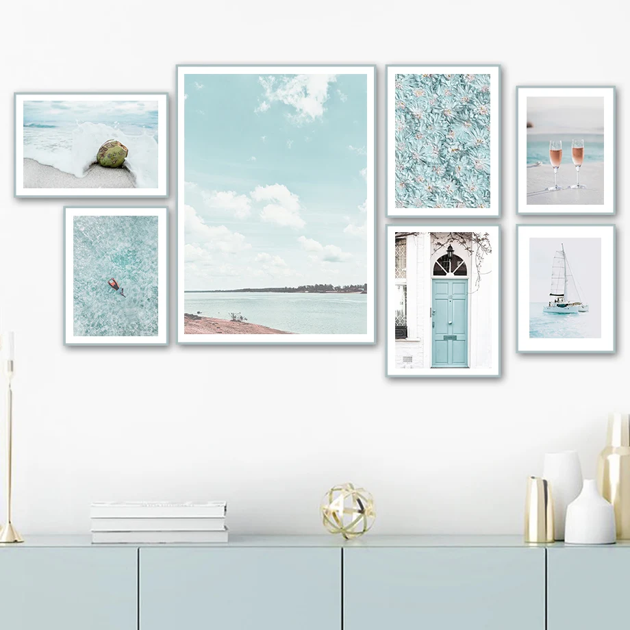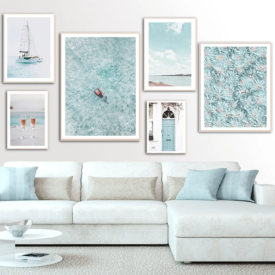 Настенная картина с изображением синего цветка, двери океана, кокоса, шампанского, настенные плакаты и принты в скандинавском стиле для декора гостиной