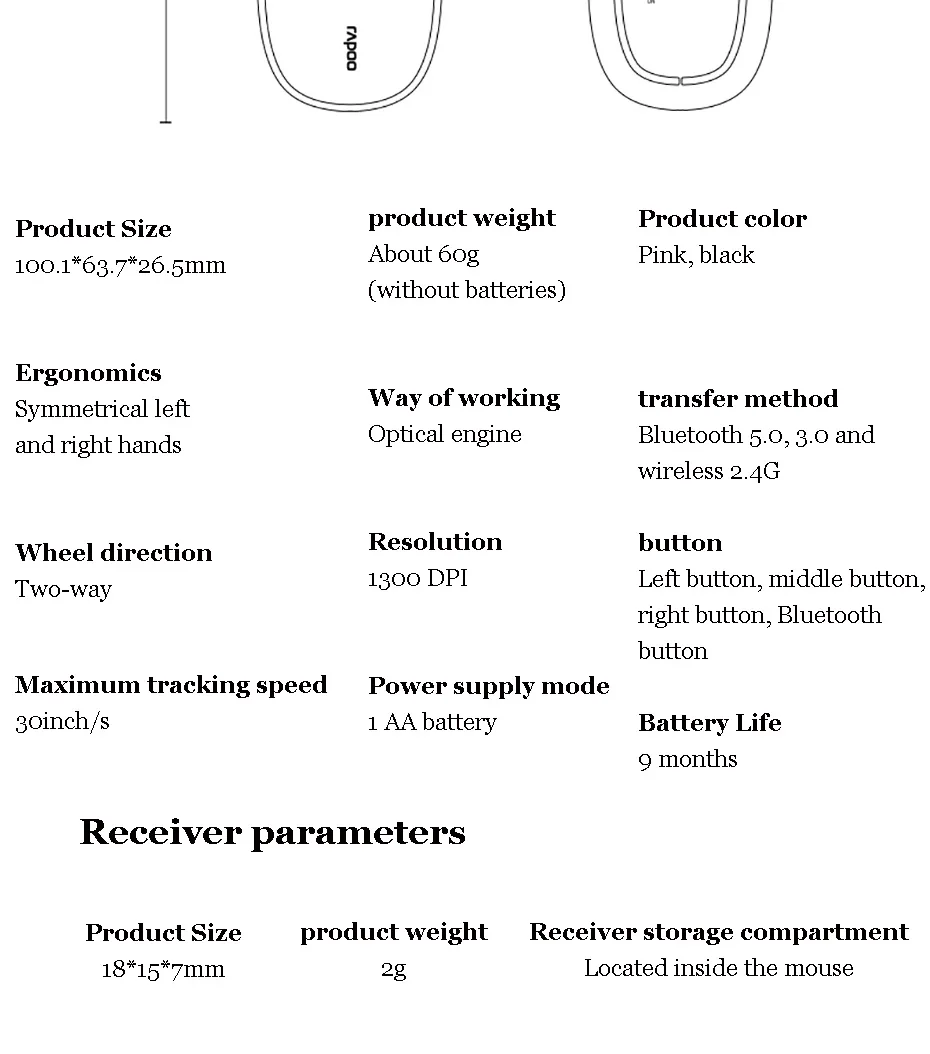 Размер изделия: 100,1*63,7*26,5 ммВес изделия: около 60 гЦвет изделия: персиковый порошок, кунжутный черныйНаправление колеса: двустороннийРазрешение: 1300DPIКнопки: Левая кнопка, Средняя кнопка, правая кнопка, Bluetooth кнопкаМаксимальная скорость отслеживания: 30 дюймов/сРежим питания: 1 аа батареяСрок службы батареи: 9 месяцев
