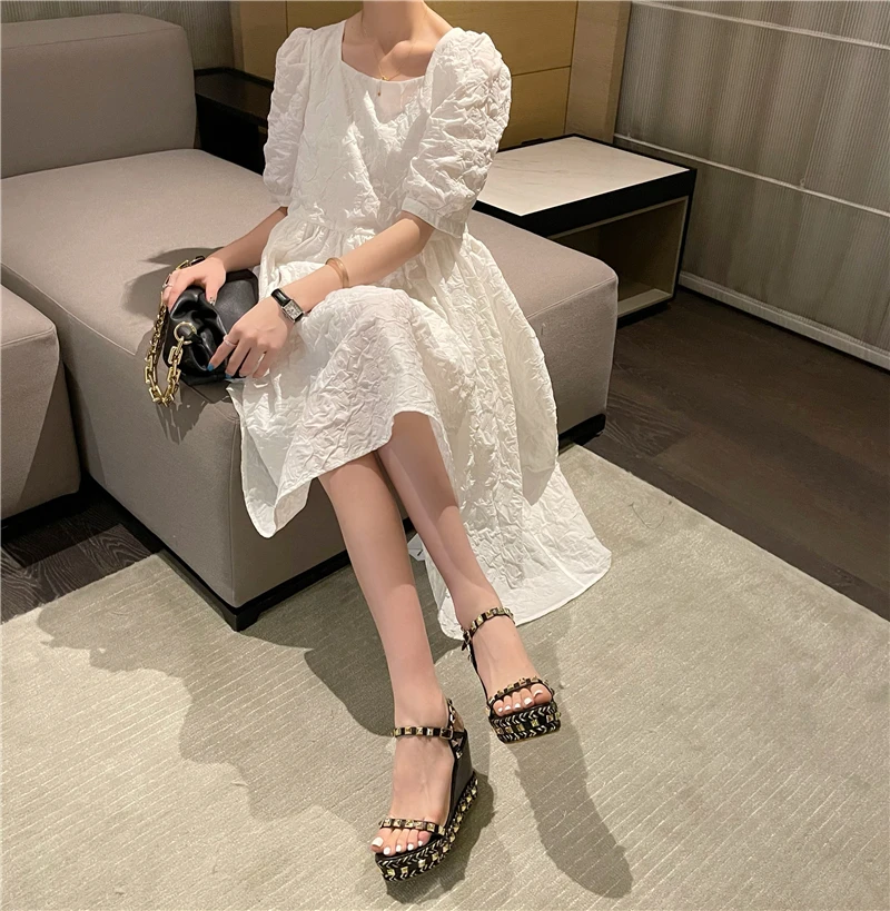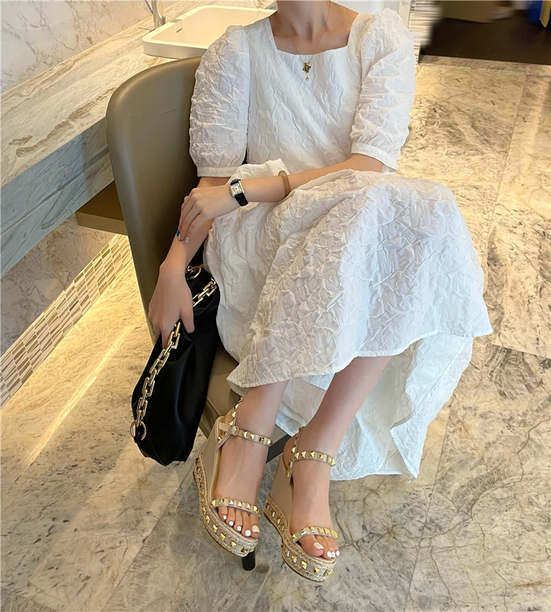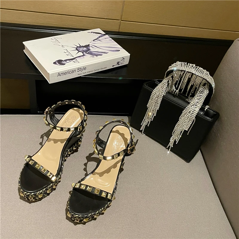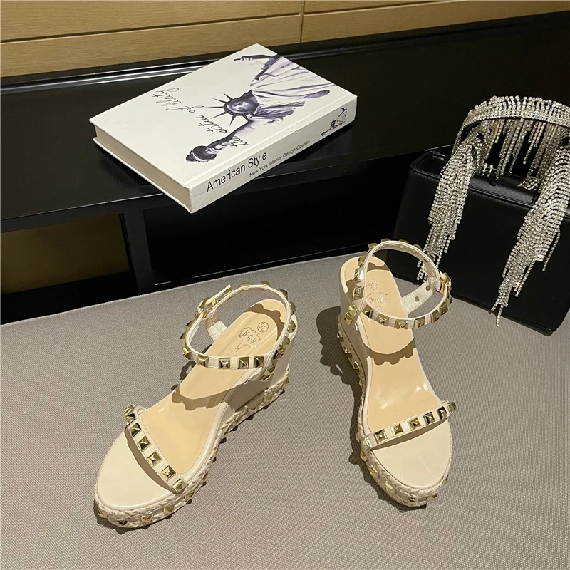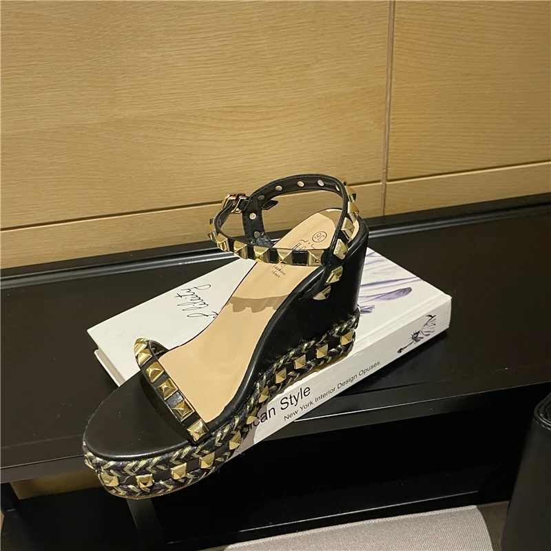 NIUFUNIженские босоножки на танкетке с заклепками; Туфли-лодочки на платформе с пряжкой и ремешком из ротанга; Летние женские Босоножки с открытым носком