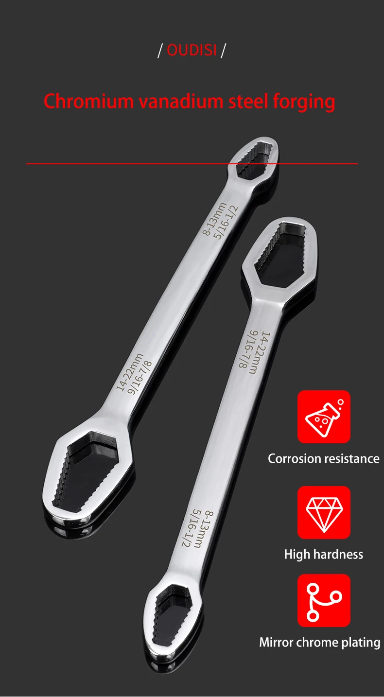 -- Изготовлен из высококачественной хромированной ванадиевой стали, ключ имеет высокую твердость и не ржавеет.-Ключ универсален. Он используется для технического обслуживания автомобилей/механических/велосипедов/мотоциклов и других сопутствующих отраслей обслуживания.-Гаечный ключ легко переносится и хранится, и его также можно дать в подарок близким и друзьям.-Гаечный ключ не легко сломать из-за затягивания и вращения гаек и болтов.