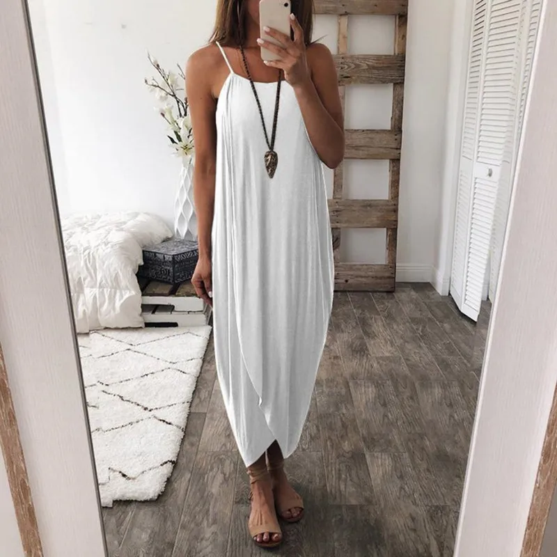 Летние пикантные тонкие бретельки Женская Макси платье 2020 модные однотонные бeз рyкaвoв пляжный Разделение халат леди миди платье размера плюс
