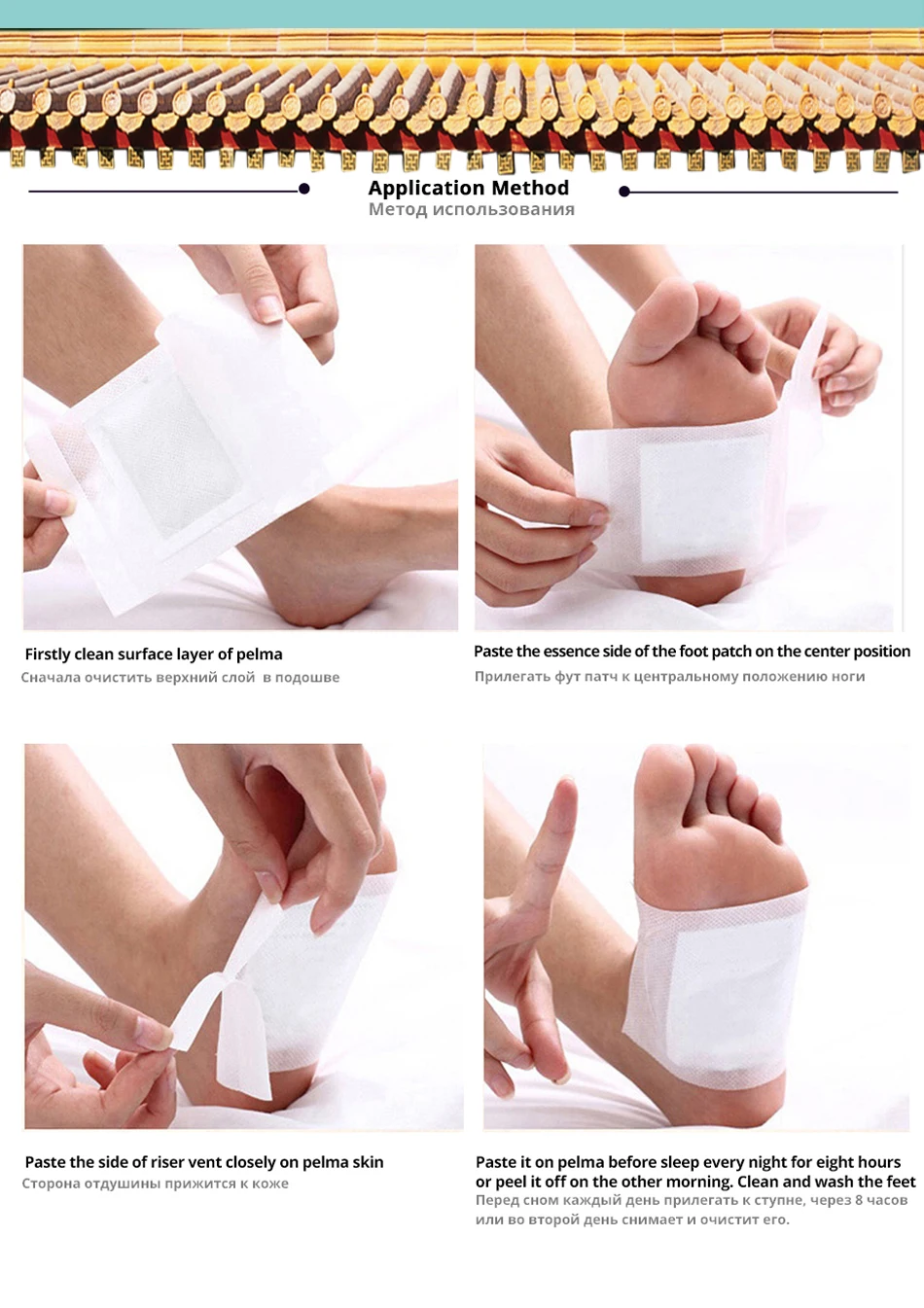 Состав: Имбирная соль, бамбуковый уксус, хитозан, декстрин, докудами, лист локата, турмалин, растительное волокно, витамин С и древесный уксус. Подушечки индивидуально обернуты для сохранения свежести. Как работают подушечки для ног?На протяжении сотен лет, восточная медицина понимала, что токсины стекают вниз в организме, накапливаясь в кончиках пальцев ног и лодыжек. Они также понимали, что накопление токсинов приводит к многим дегенеративным болезням. Например, болезненный ревматизм и артрит были вызваны кислотными токсичными жидкостями, собирающимися вокруг суставов. В рефлексотерапии ноги считаются каналами для многих важных органов, с более чем 60 точками акупунктуры на подошвах наших ног. Подушечки для ног содержат натуральные ингредиенты, которые стимулируют эти акупунктурные точки через комбинированное действие дерева/бамбукового уксуса, дальней инфракрасной энергии и отрицательных ионов выбросов. Эта стимуляция приводит к поломке воды и молекул отходов, которые бесплатно блокируют кровообращение и лимфатические системы. Очищение начинается естественным образом на подошвах наших ног. Основной эффект от детоксикации ног Kinoki-детоксикация. Пластыри впитывают ваши токсины после использования в течение всей ночи. Вы можете увидеть это из-за изменения цвета после его использования. Чем больше грязи вы видите, тем больше токсинов впитывается. После последовательного использования в течение определенного периода, они будут очищаться каждое утро. Это означает, что большинство токсинов в вашем теле уже выпущено. Помимо ваших ног, вы также можете нанести Эти подушечки на другие части вашего тела, включая спину, колени, локти и т. д. Преимущества ботинок для ног:Высвобождение нежелательных токсиновУвеличьте уровень энергииУменьшает боль, боли, головные боли и усталостьСнятие стрессаУлучшает обмен веществУлучшить ваше кровообращениеУлучшение потери весаПолностью сдержанный-работает во время снаПростой и простой в использовании Указания для использования:1. Нанесите пластырь Kinoki detox за час до кровати.2. Вымойте и высушите ноги или часть тела перед нанесением пластырей kinoki Detox.3. Возьмите один клейкий лист и Медленно снимите бумагу.3. Поместите ножную подкладку на клейкую поверхность, чтобы «положить клейкий лист на эту сторону» и поместите на подошву вашей стопы или на желаемую область другой части тела.(Носки можно носить при необходимости)4. Носите в течение 8-10 часов, затем удалите коврик.5. Протрите поверхность влажным полотенцем, пока оно не станет липким.6. Использованные пластыри будут выглядеть темно-зеленоватыми или сероватыми, так как они поглощают токсины и отходы от вашего тела. 7. Продолжайте использовать каждую ночь до тех пор, пока не исчезнет обесцвечивание подкладки.8. При использовании пластырей kinoki появляются признаки осветления, применяйте один или два раза в неделю для обслуживания. Предостережения: Не надевайте рану. Если у вас аллергия, не используйте эти подушечки. Этот продукт не предназначен для диагностики или лечения любых заболеваний. Если у Вас возникли какие-либо заболевания, обратитесь к врачу.1 партия = 200 шт = 100 шт пластырей (50 небольших упаковок) + 100 шт клеев1 коробка = 20 шт = 10 шт пластырей + 10 шт Клей1 партия = 10 коробок = 200 шт = 100 шт пластырей (50 небольших упаковок)+ 100 шт Клей
