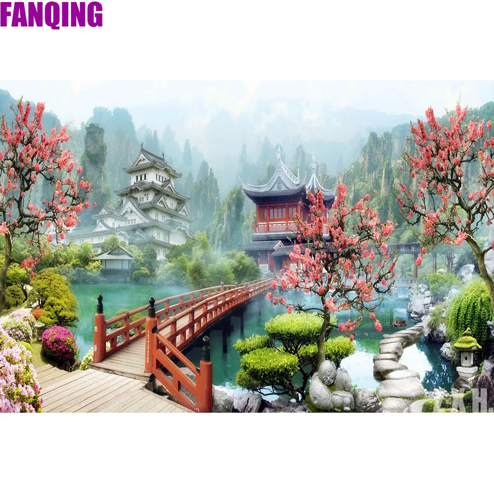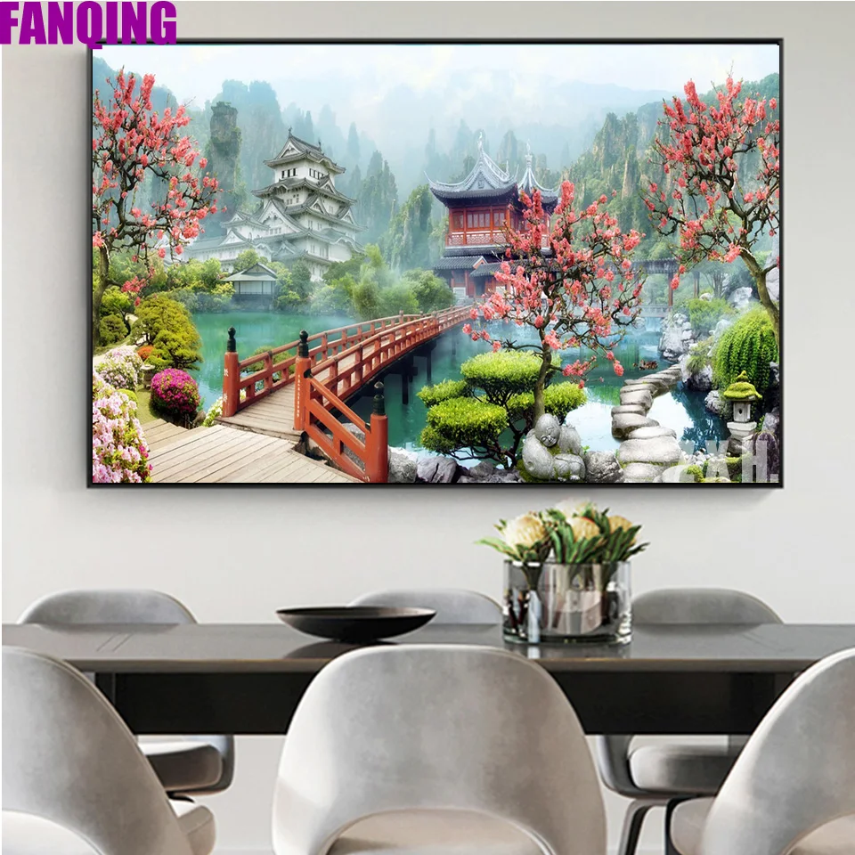 Алмазная картина, полный квадрат, китайское садовое здание, озеро, пейзаж, алмазная вышивка, набор стежков, стразы, Декор
