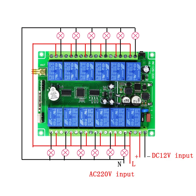 Переключение ---------------- нажмите кнопку передатчика 1 в течение 1 времени, реле приемника 1th включено, нажмите кнопку 1 снова, реле приемника 1th выключено, те же 2/3/4/5/6 --- 12 являются независимыми.