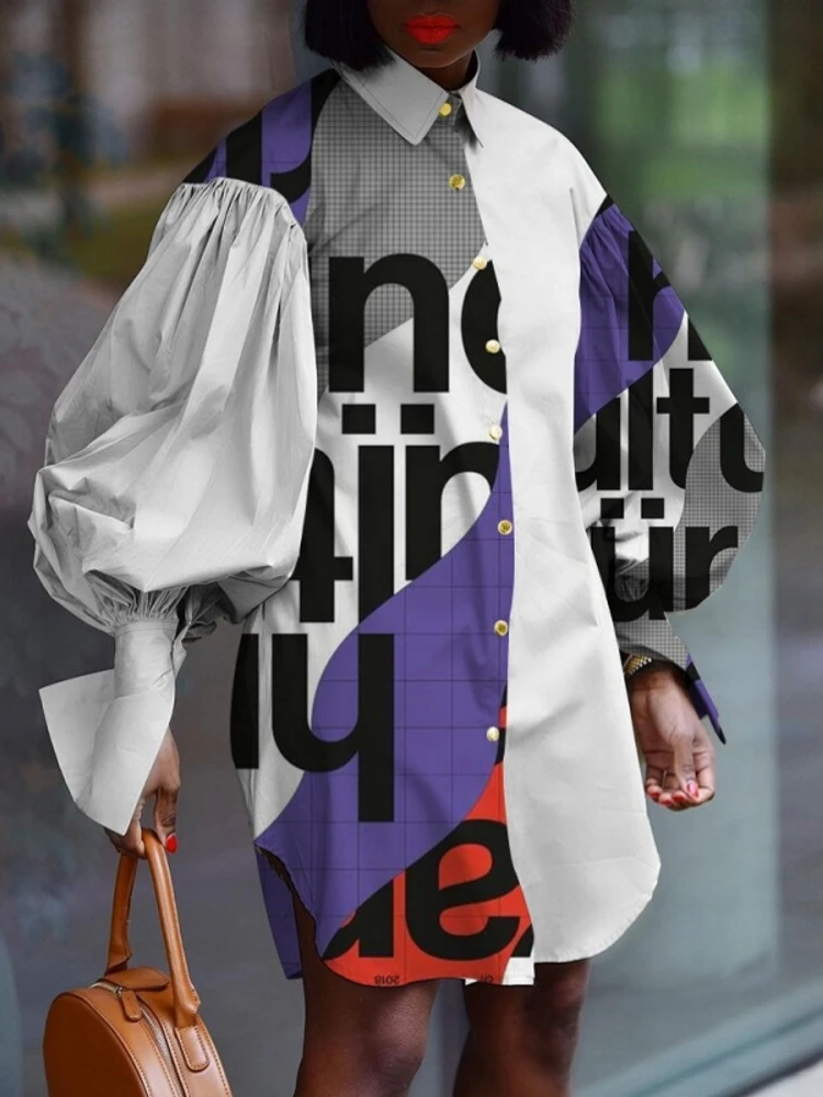 Женское платье-рубашка с рукавами-фонариками, повседневное Свободно...