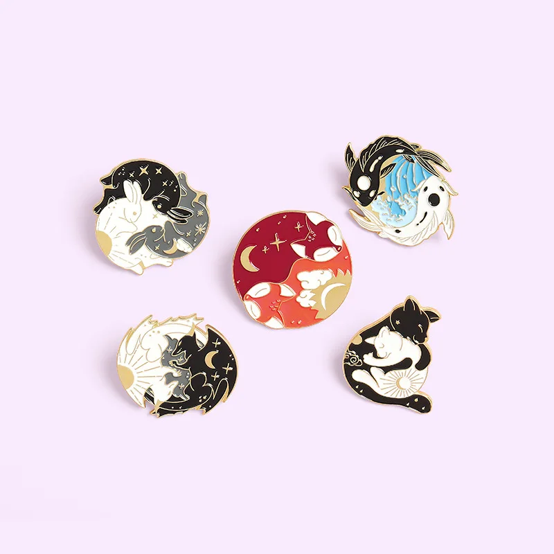 Эмалированная заколка с изображением солнца, луны, лисы, кои, кроли...