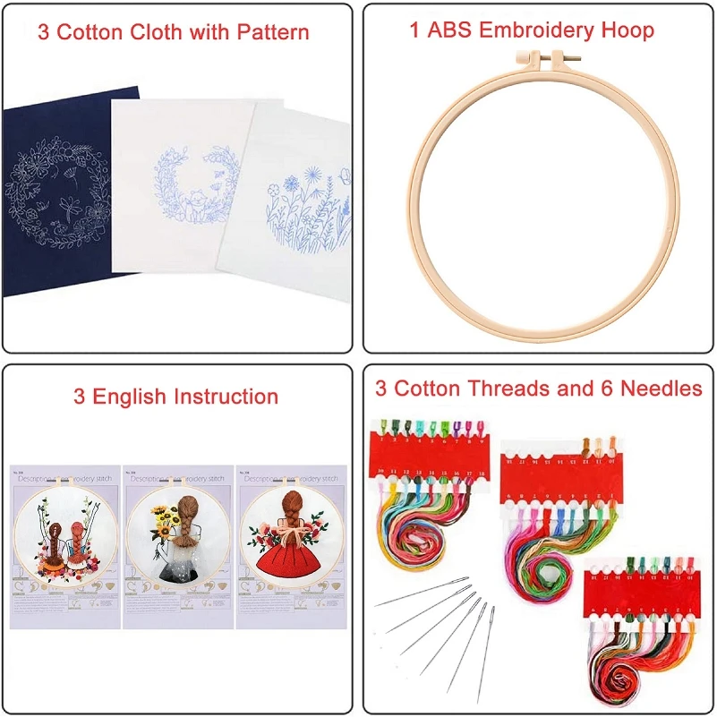 1 шт. 20 см/8 дюймов пластиковый обруч для вышивки 1 шт. хлопковая ткань для вышивки с рисунком 1 Набор нитей для вышивки 2 шт. иглы для вышивки 1 шт. инструкции на английском языке