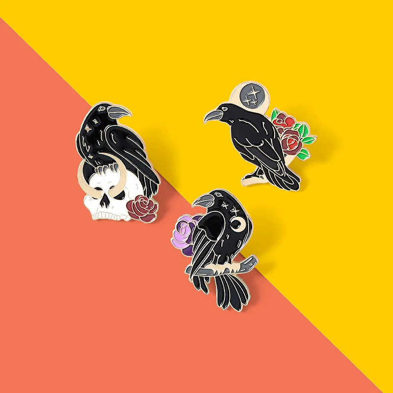Эмалированные булавки в готическом стиле с черной вороной, птицей, черепом, луной, цветами
