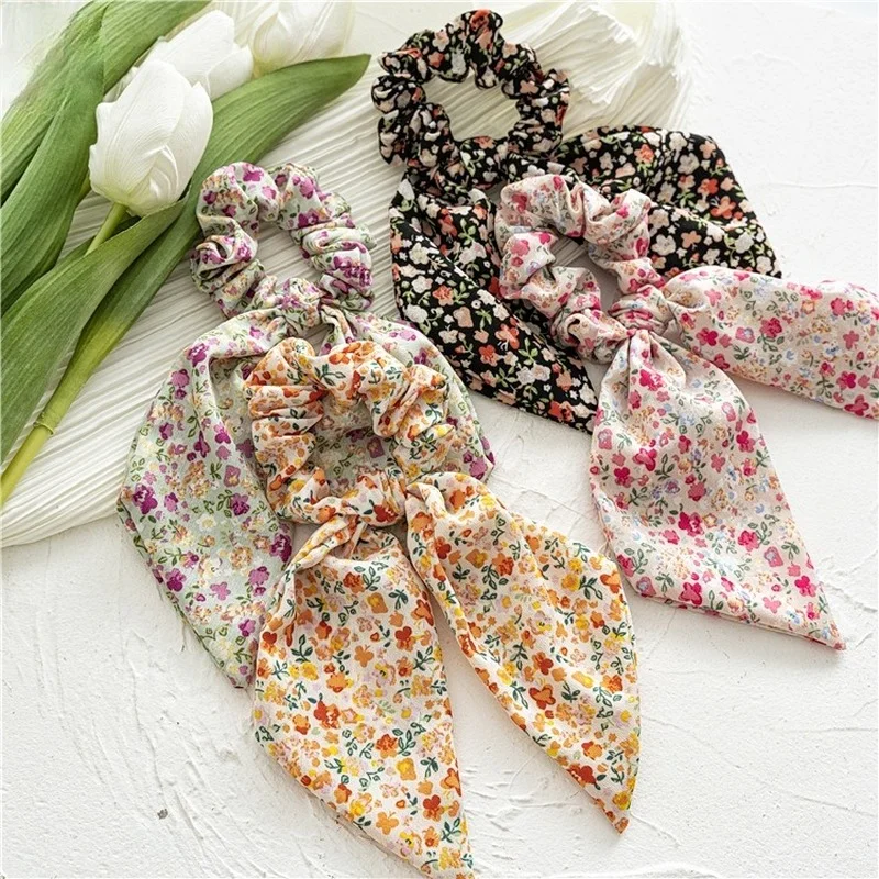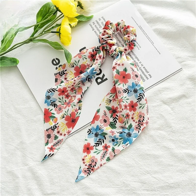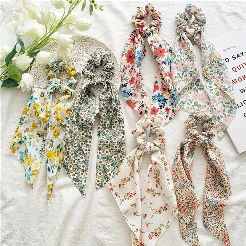 Шифоновые резинки с узелком, галстук-бабочка, держатель для конского хвоста, женские аксессуары для волос, эластичная Длинная лента с принтом, упаковка бандана, зажимы, лента