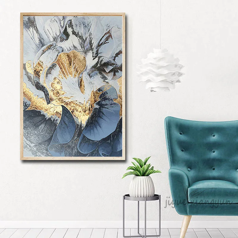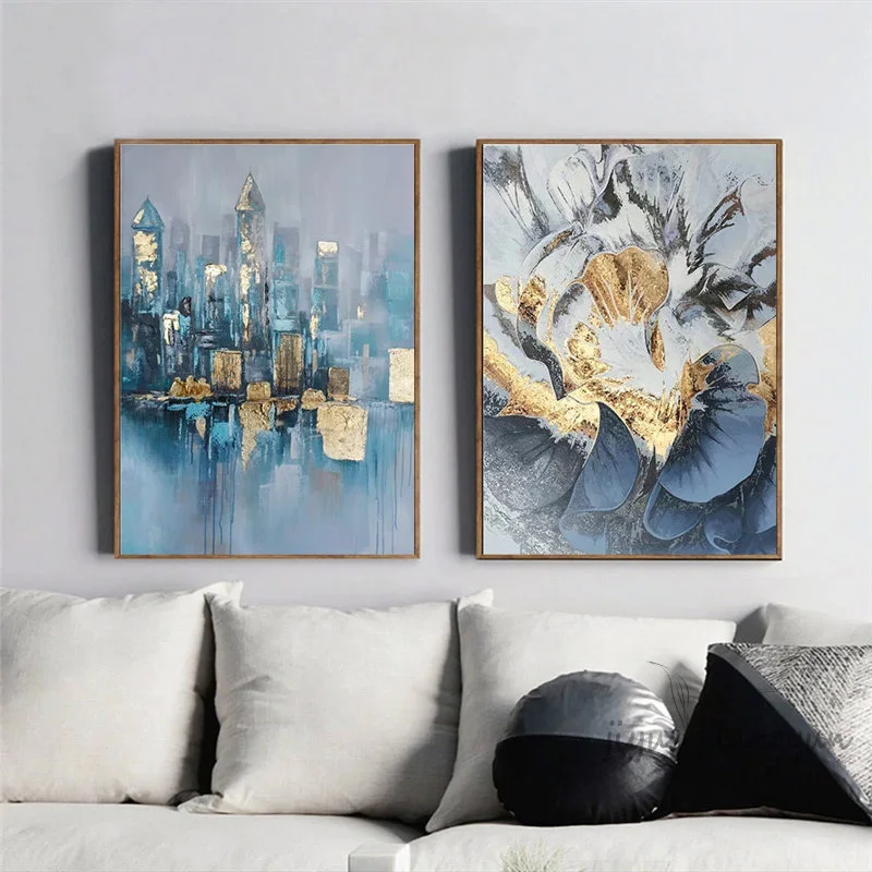 Скандинавский абстрактный городской синий строительный настенный художественный постер картина, постеры из золотой фольги, украшение для гостиной и дома