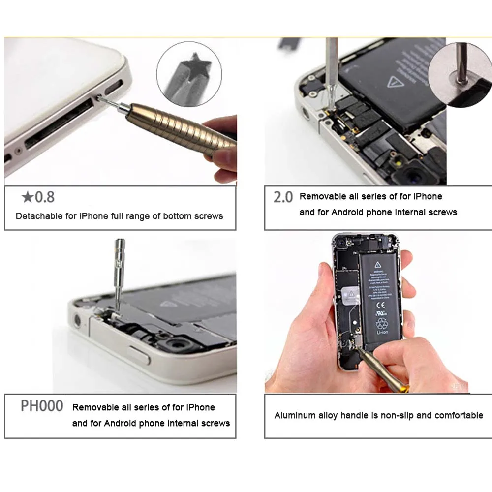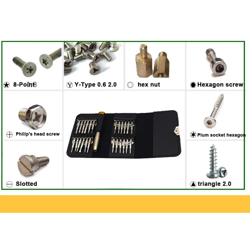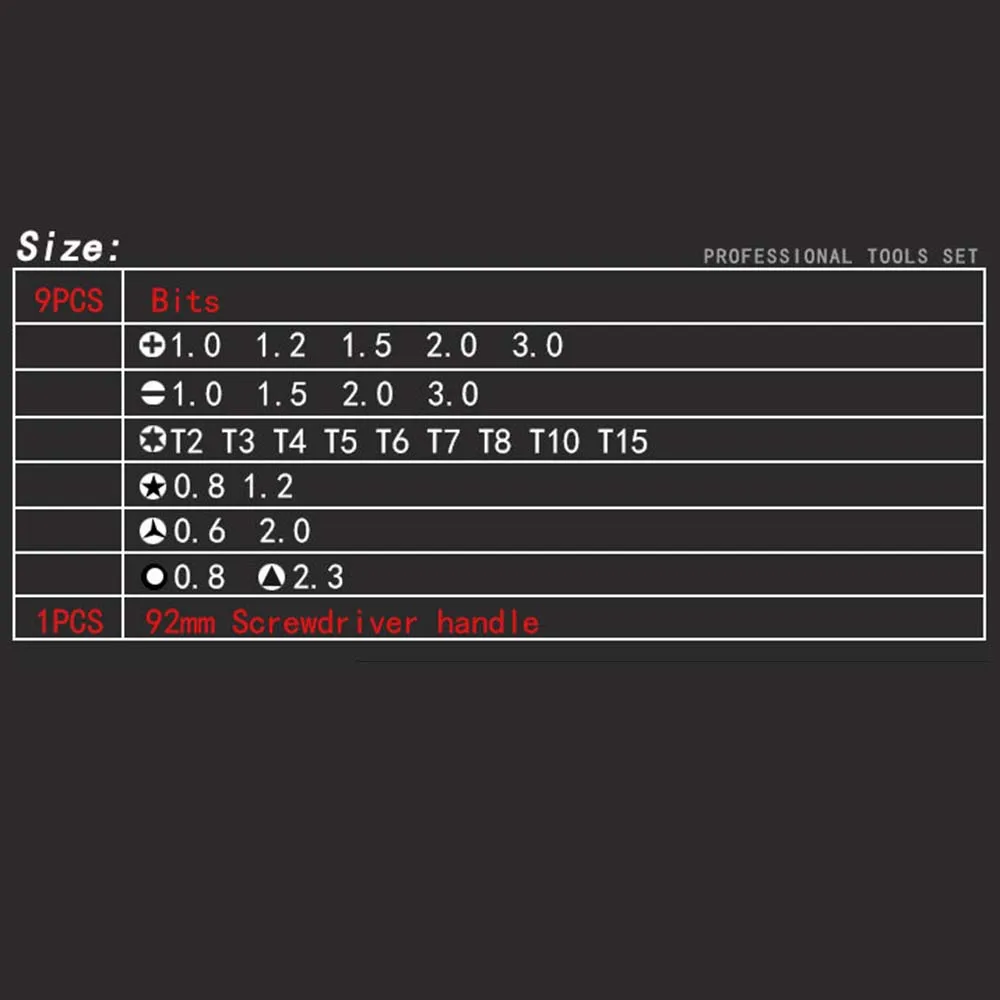 Особенности: 1. Упаковка бумажника, светильник и портативный. 2. Внутренний Тип головки партии фиксированный, не легко разбросан. 3. Высокоточная отвертка, высококлассная сталь (хром-ванадиевая сталь) специальной термообработкой, твердость может достигать HRC52-60. 4. Полный набор из 24 головок, полные спецификации, могут быть адаптированы для работы во многих различных областях. 5. Ручка в производстве авиационного сплава, светильник и долговечность. 6. Хвост разработан с прецизионным подшипником, гибкий и простой в использовании. 7. С компактной и Ассорти упаковкой, это очень легко носить с собой везде. 8. Как профессиональные аппаратные инструменты, он может предоставить вам самую мощную функцию. 9. Подходит для большинства цифровых продуктов, различных типов компьютеров, мобильный телефон, камера, очки, часы. Характеристики: Размер кобуры: прибл. 20x10,3 см/7,8x4,0 дюймов Цвет кобуры: черный Цвет инструмента: серебристый Материал ручки: алюминиевый сплав Материал бита: хром-ванадиевая сталь Характеристики: Набор отверток, инструменты для ремонта мобильных телефонов Примечания: из-за разницы между различными мониторами изображения могут не отражать фактический цвет изделия. Детали: Набор отверток 25 в 1, включая: Шестигранная отвертка (10 шт.): T2 T3 T4 T5 T6 T7 T8 T10 T15 Отвертка Phillips (6 шт.): PH0000, PH000, PH00, PH0, PH1(2 шт.) Прямая отвертка (4 шт.): 1,0, 1,5, 2,0, 3,0, Отвертка Pentacle (2 шт.): 0,8, 1,2 Треугольная отвертка (1 шт.): 2,3 Отвертка типа Y (1 шт.): 2,0 Отвертка (1 шт.): 1,0 Ручка отвертки (1 шт.) Посылка включает: 1 x набор отверток 25 в 1