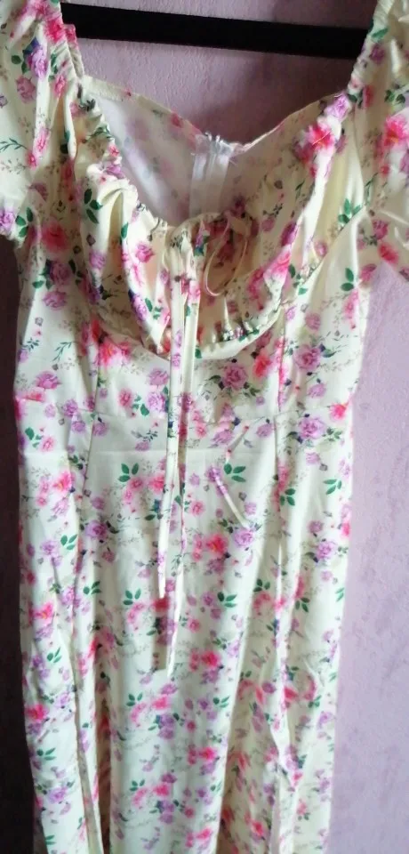 Платье не понравилось. если внимательно присмотреться, крой лифа отличается от заявленного. Нижняя линия кокетки на груди проходит на 2 см выше, чем моя грудь, что смотрится ужасно. Размер S подошёл на параметры 84-64-89. Сшито неаккуратно, нитки везде висят. Видно, что дешёвка.
