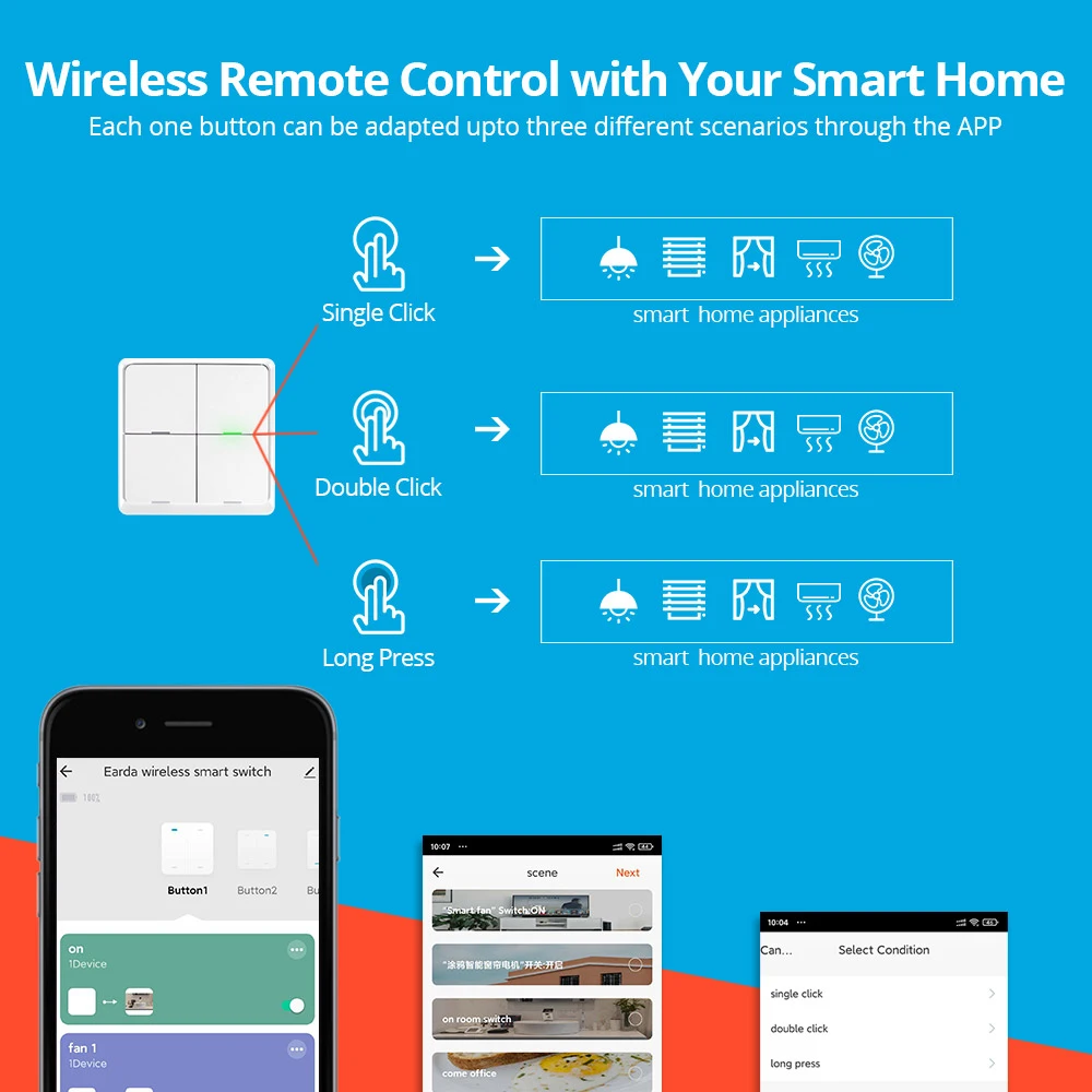 При изготовлении каждой кнопки переключателя можно удовлетворить множество потребностей, Реализовывая различные сцены. Вообразите связь smarts, чтобы создать бесконечное пространство с проводным переключателем сцены.