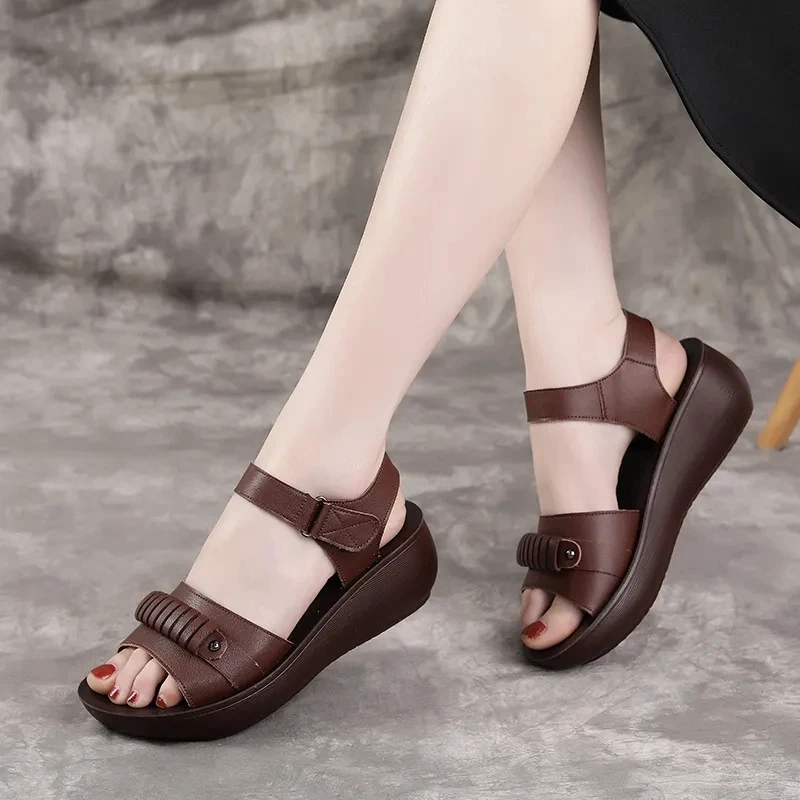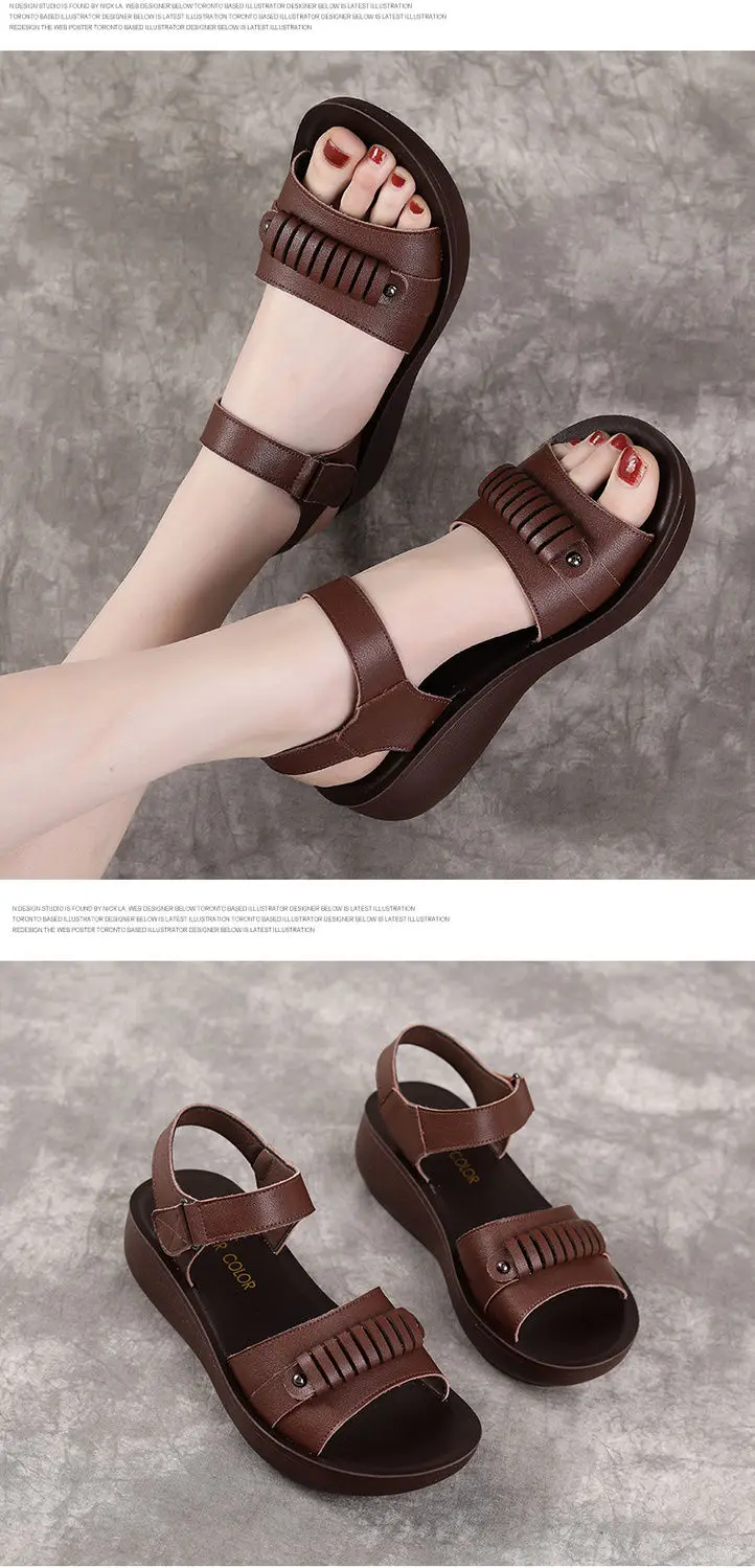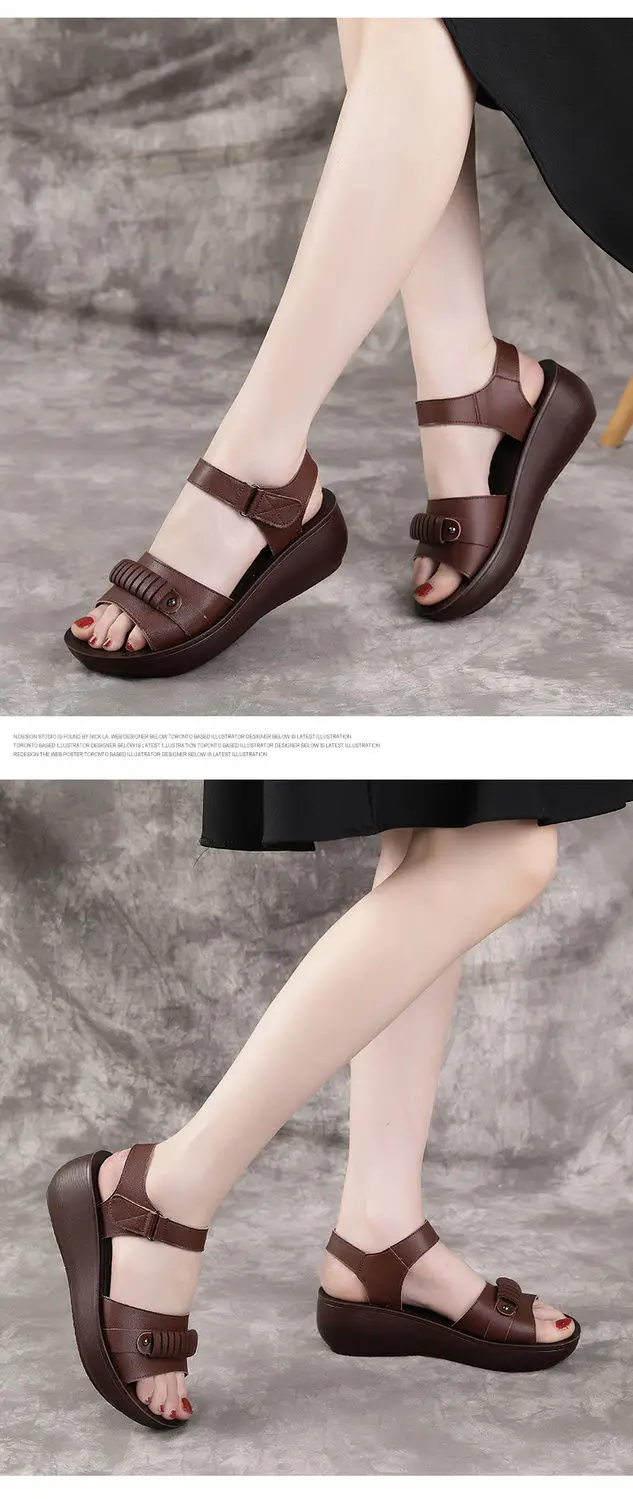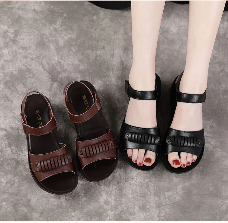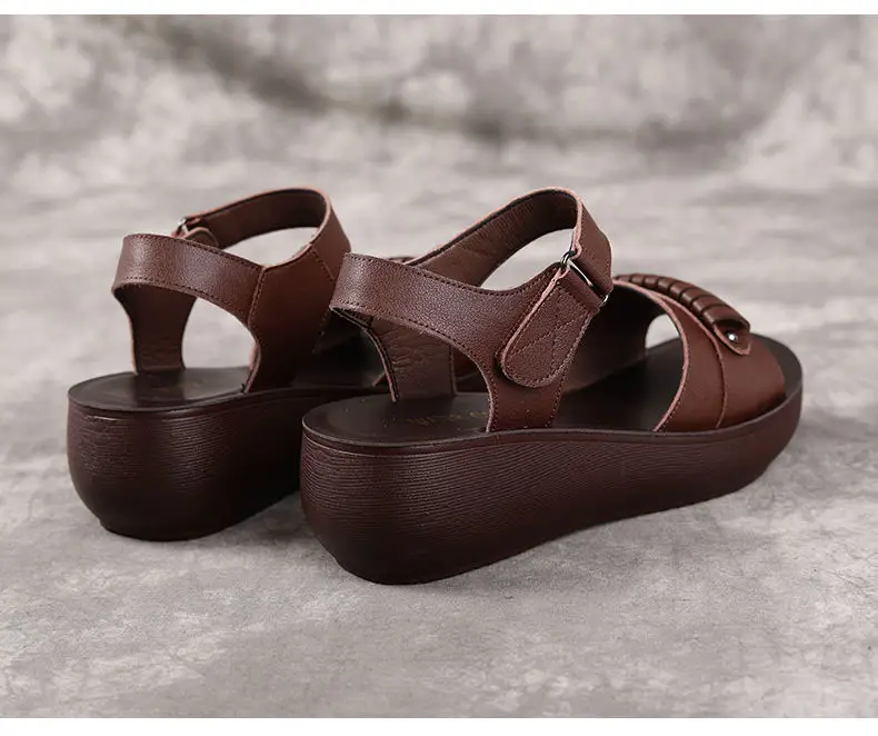 Сандалии-гладиаторы из натуральной кожи, винтажные коричневые, на плоской платформе 5 см, с открытым носком, на липучке, лето 2021