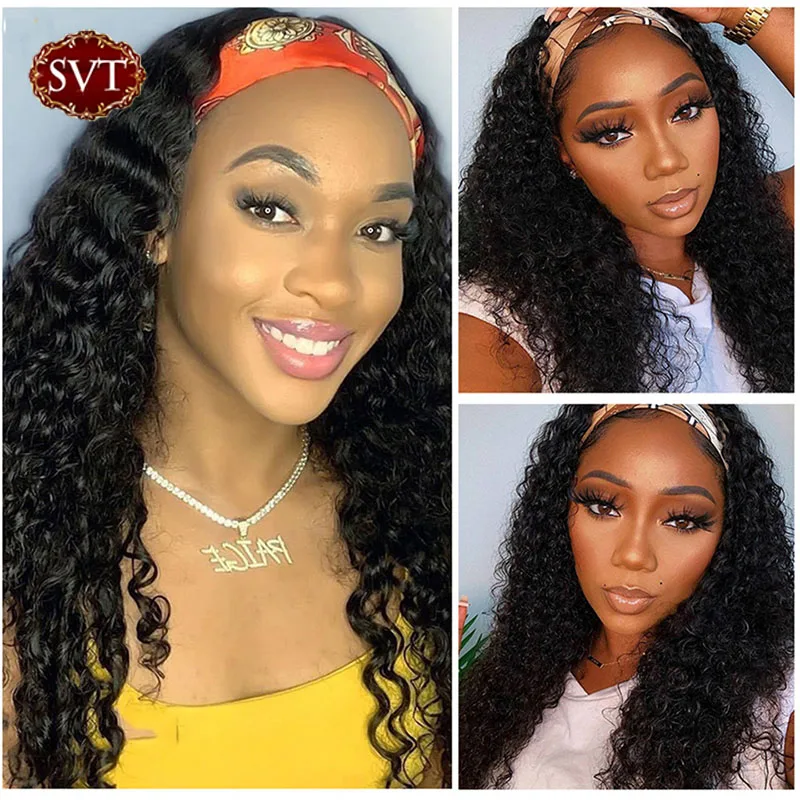 SVT вьющиеся парик с головной повязкой натуральный Цвет 100% Реми Вьющиеся парики из натуральных волос для черный Для женщин повязка на голову парик для начинающих на ощупь