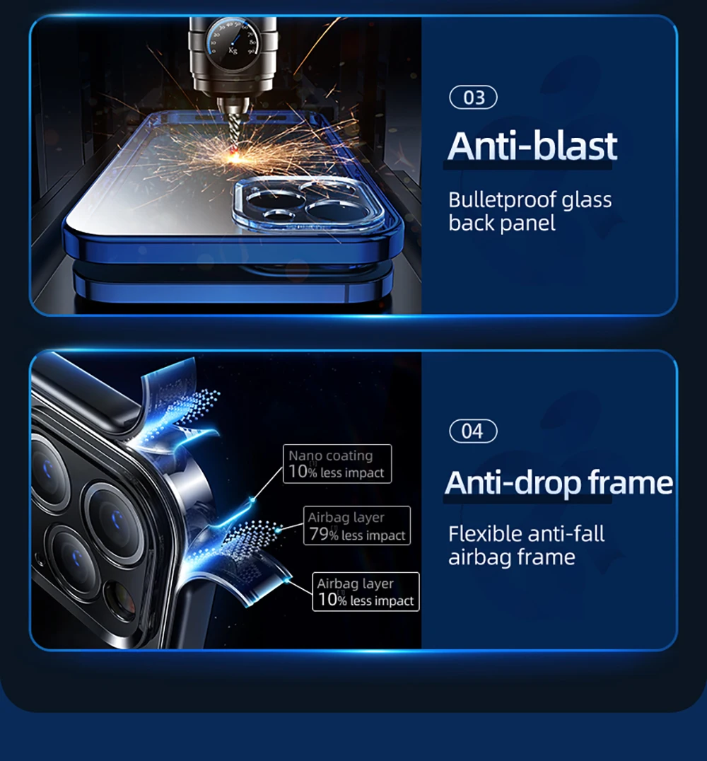 1. Ультра HD-прозрачное авиационное стекло Посылка из 2 линз-двойная защита, попадание в золу 3. Противоударная пуленепробиваемая стеклянная задняя панель 4. Рама с защитой от падения-гибкая рама подушки безопасности с защитой от падения