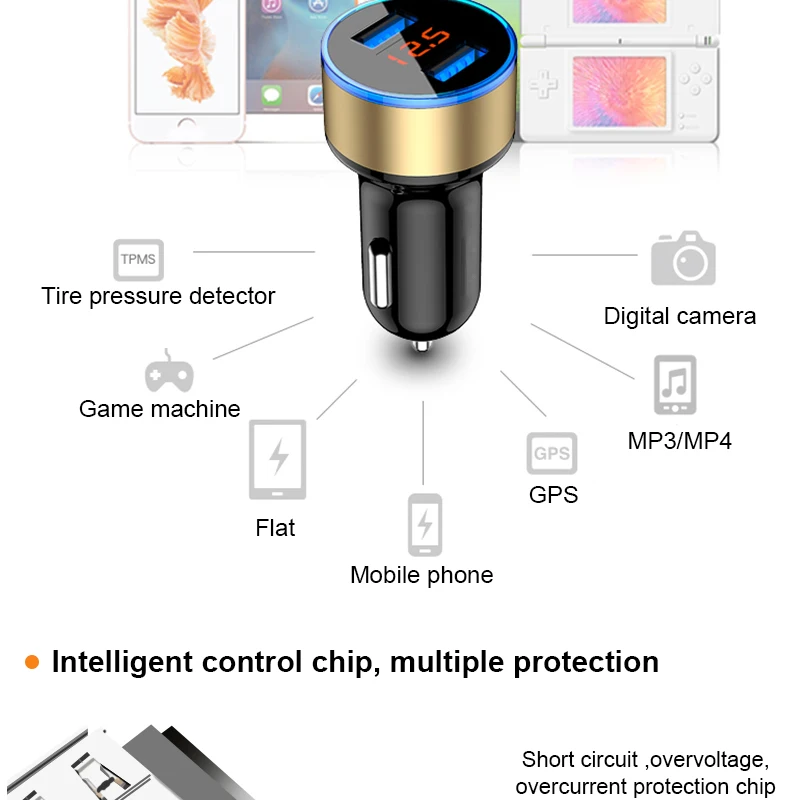 Монитор напряжения автомобильного аккумулятора real-своевременно (когда для зарядки не подключено устройство); Дисплей зарядного тока при зарядке телефона
