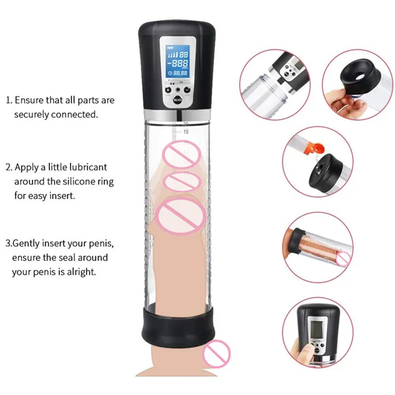 Это USB Перезаряжаемый автоматический насос для увеличения пениса с ЖК-дисплеем для мужчин, который может эффективно помочь вам достичь увеличения пениса для мужчин, что делает вас большим человеком! Изготовлен из превосходного медицинского материала, не ядовитый, безопасный и надежный.