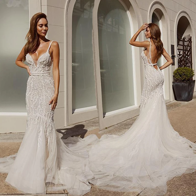 Свадебное платье русалки 2021, сексуальное кружевное платье на тонких бретельках, расшитое бисером, с открытой спиной, Пляжное длинное свадебное платье для невесты, белые платья