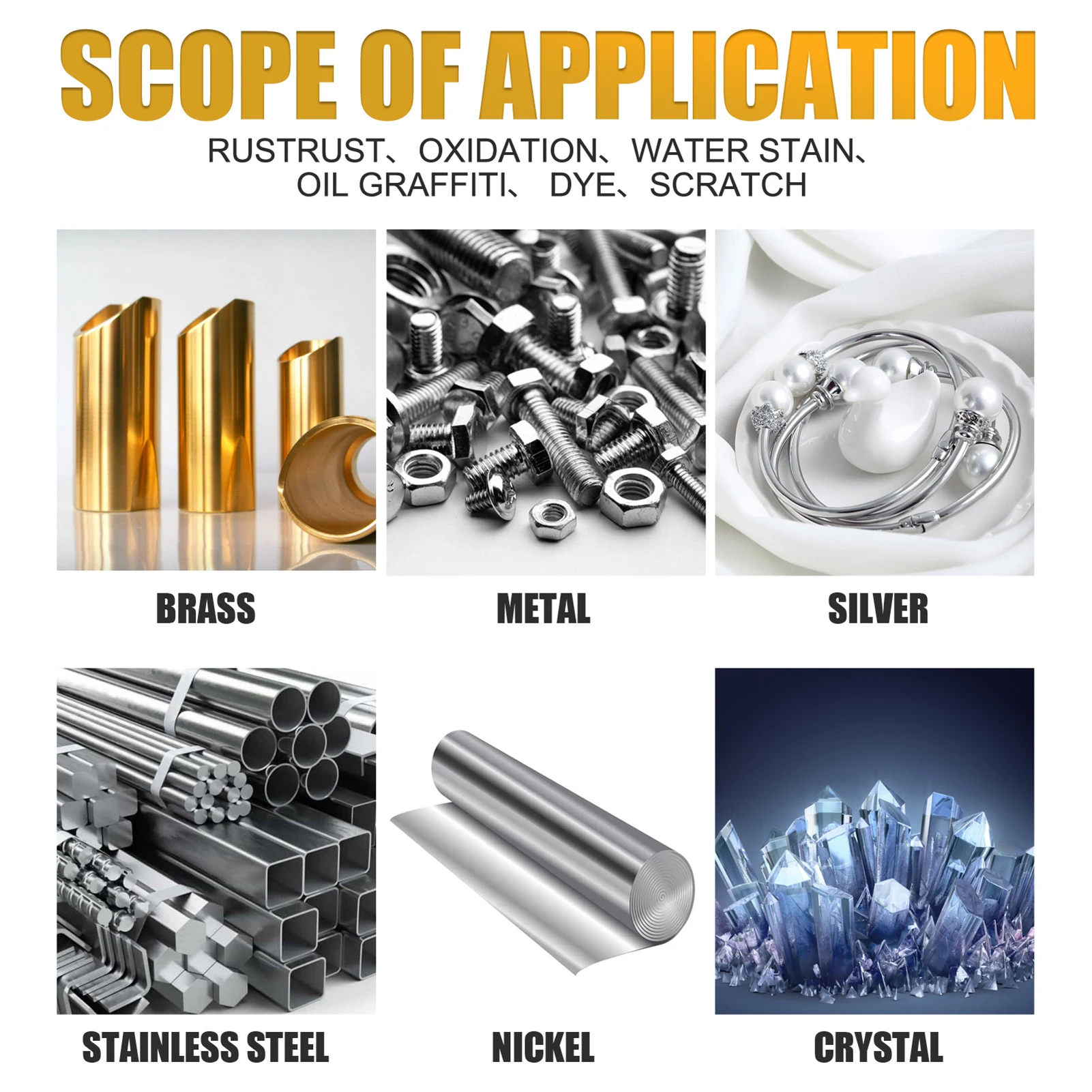3. Легко и без усилий: просто нанесите металлический Полирующий крем непосредственно на металлическую поверхность, а затем протрите его тканью. Вы увидите новый металлический товар за несколько секунд! Немедленно удалите все упрямые потускнения, такие как обесцвечивание, ржавчина, окисление, водяные пятна, термо обесцвечивание, дегтяра, масло, отпечатки пальцев, граффити, красители и т. д.