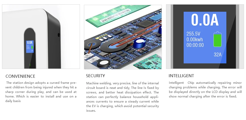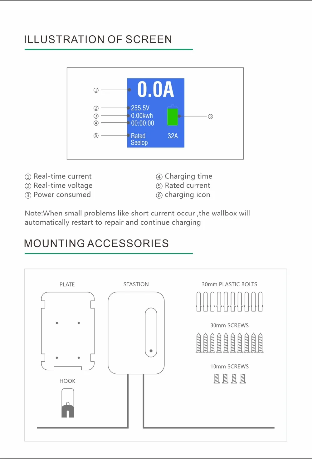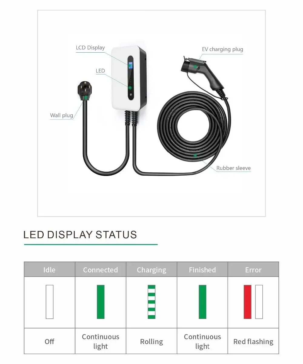 ЖК-дисплей для отображения всех данных автомобиля на зарядной станции во время зарядки. Вы можете увидеть состояние зарядки, включая ток, напряжение и температуру. Винты помещаются в коробку, поэтому вам не придется беспокоиться о падении экрана. 20 футов кабель оставляет достаточно места между вашим автомобилем и зарядной станцией