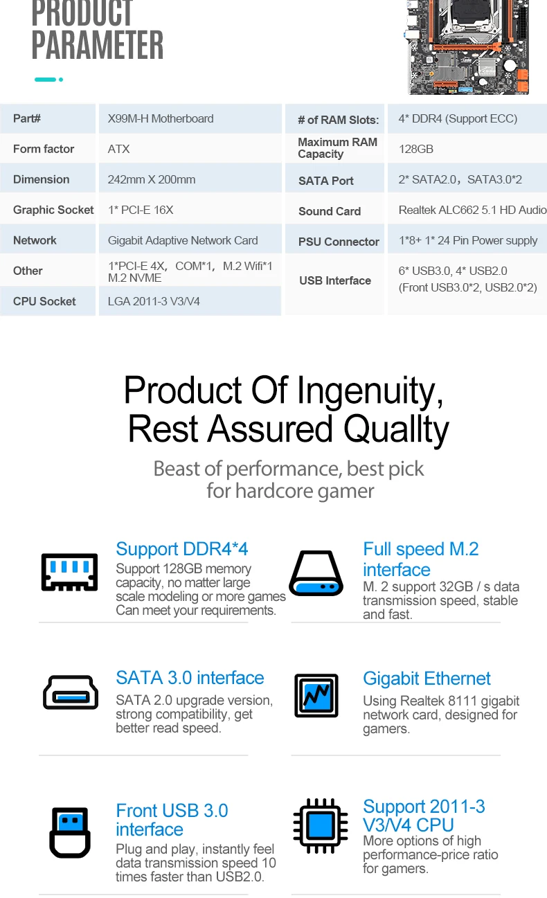 ОсобенностиБренд: JINGSHA100% новый и высокое качество!Поддержка памяти сервера REG ECC.Поддержка M.2 NVME SSD.Высокая совместимость для более высокого опыта.Все твердые конденсаторы, тонкая работа, профессиональная стабильность.Гнездо питания имеет 8-pin, 24-pin разъем питания.Спецификация:Procesador: совместимость с процессором Intel 2011 v3 V4 серии, Совместимость с con E5 2620V3,E5 2678V3,E5 2650V3,E5 2640V3,E5 2630V3,E5 2690V3,E5 2680V3 и т. д.Набор микросхем: Intel®Набор микросхем X99Pantalla: PCIE pantalla de gramficos discretosПамять: Escritorio 4 * DDR4/Memoria ECC 2133 МГц, 2400 МГц, 64 ГБSonido: чип Realtek ALC662 integrado (совместимый с con 5,1 canales)Tarjeta de red: 1 * Realtek RTL8111H tarjeta de red GigabitAlmacenamiento: 4 * SATA 3,0 2 * SATA 2,0 4 * USB2.0 6 * USB3.0Ranura de expansión: "1 * ranura PCIE 4X, 1 * intertaz NVME M.2, intertaz de WIFI-M2 1 *",1 * ps/2Инструкции по покупке:1: цвет нижней пластины слота может отличаться от партии к партии, но это не повлияет на использование продукта. Продукт постоянно оптимизирован и обновлен.2: Пожалуйста, учитывайте разницу в 1-3 мм из-за ручного измерения.3: из-за различных дисплеев и другого светильник, изображение может не показать фактический цвет товара. Спасибо за понимание.4: Эта планформа нуждается в мощном источнике питания. Пожалуйста, убедитесь, что ваш источник питания может быть достаточно для поддержки этой формы. (Не менее 500 Вт брендовый источник питания)5: аккумулятор на материнской плате будет удален перед отправкой, так как батарея запрещена на CN post и на заказЧто касается проблемы с налогом, пожалуйста, убедитесь, что вы можете решить проблему таможенного оформления самостоятельно. Если вы не можете решить проблему, мы не рекомендуем вам покупать товары в наших магазинах. Мы не несем ответственности за таможенные пошлины. Спасибо за понимание.