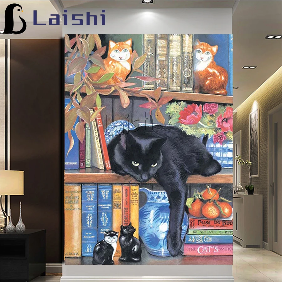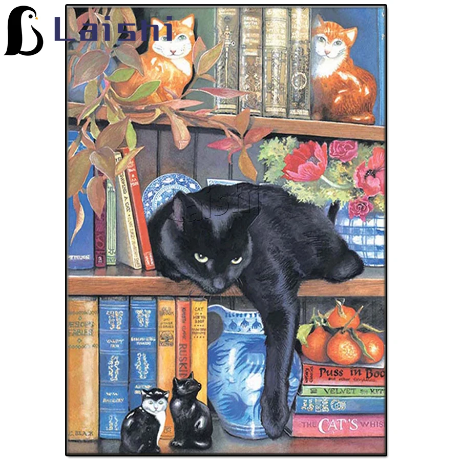 DIY 5D квадратная Алмазная вышивка для домашних животных, черная книжная полка с котом ручная работа круглая инкрустация Стразы Вышивка крестиком Животное украшение для дома