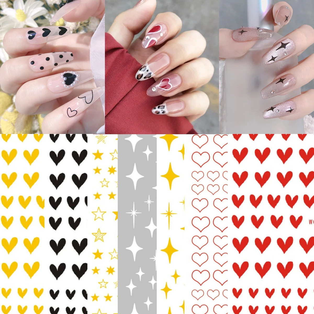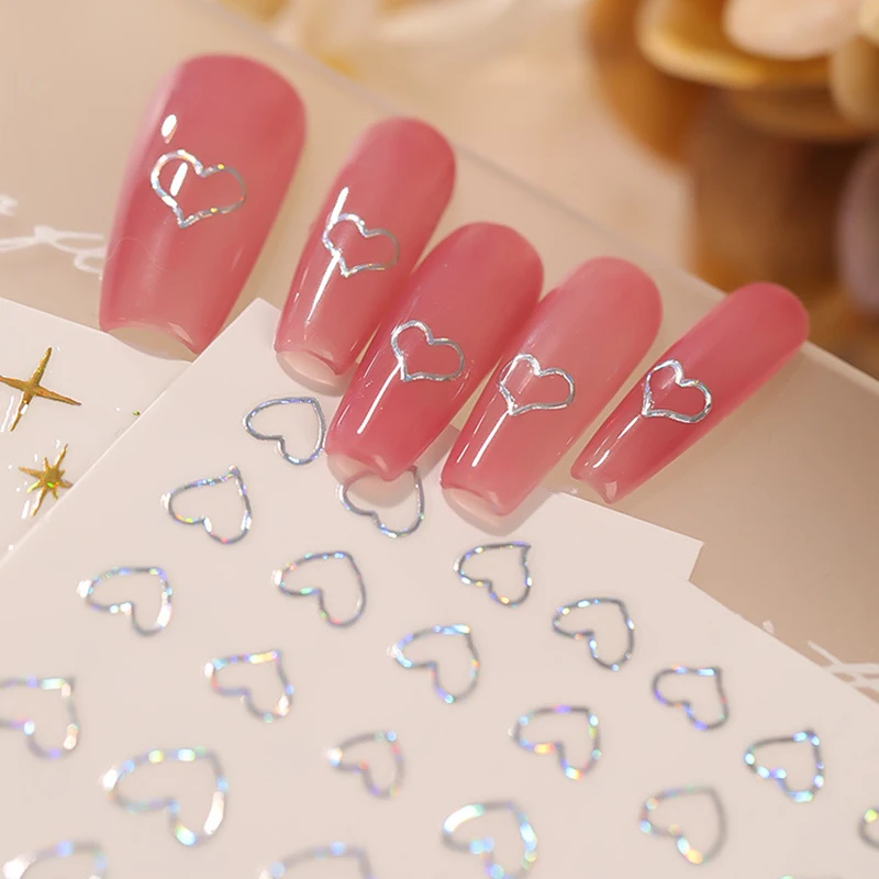 3D лазерные наклейки для ногтей, милые черные, красные сердца, клейкие украшения для ногтей, золотые, серебряные, блестящие звезды, наклейки для ногтей, подарки на день рождения