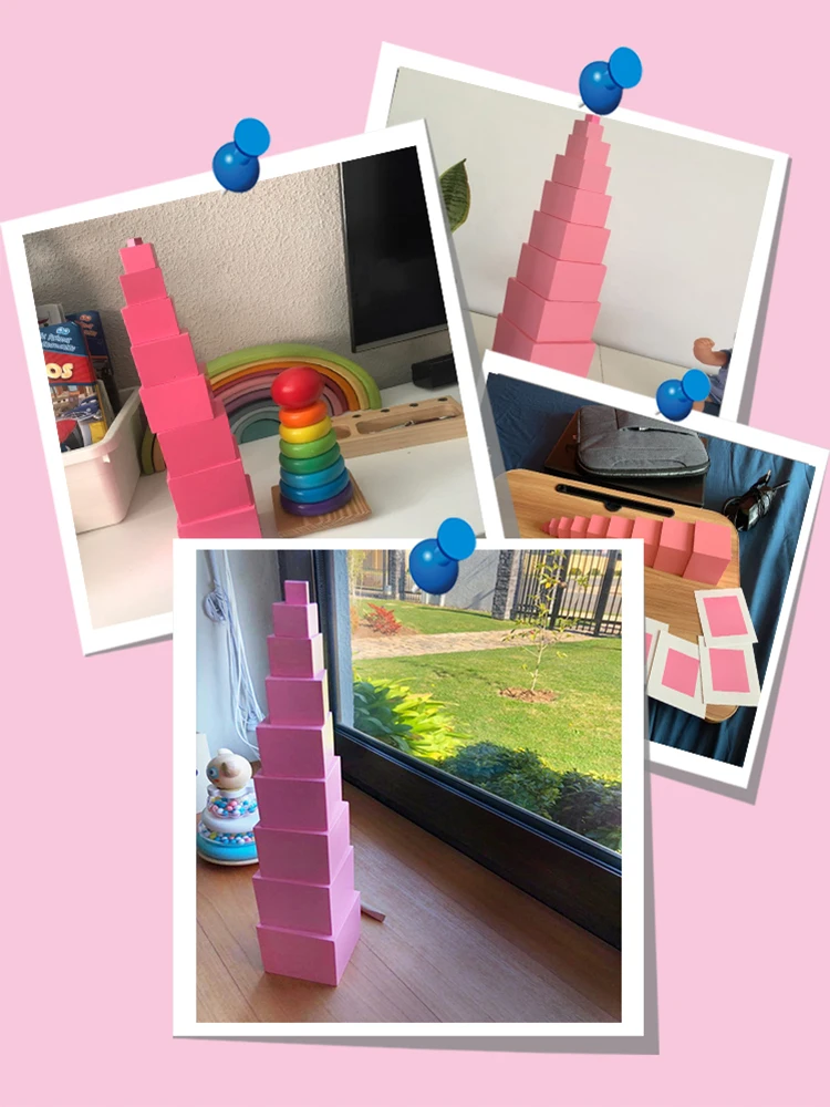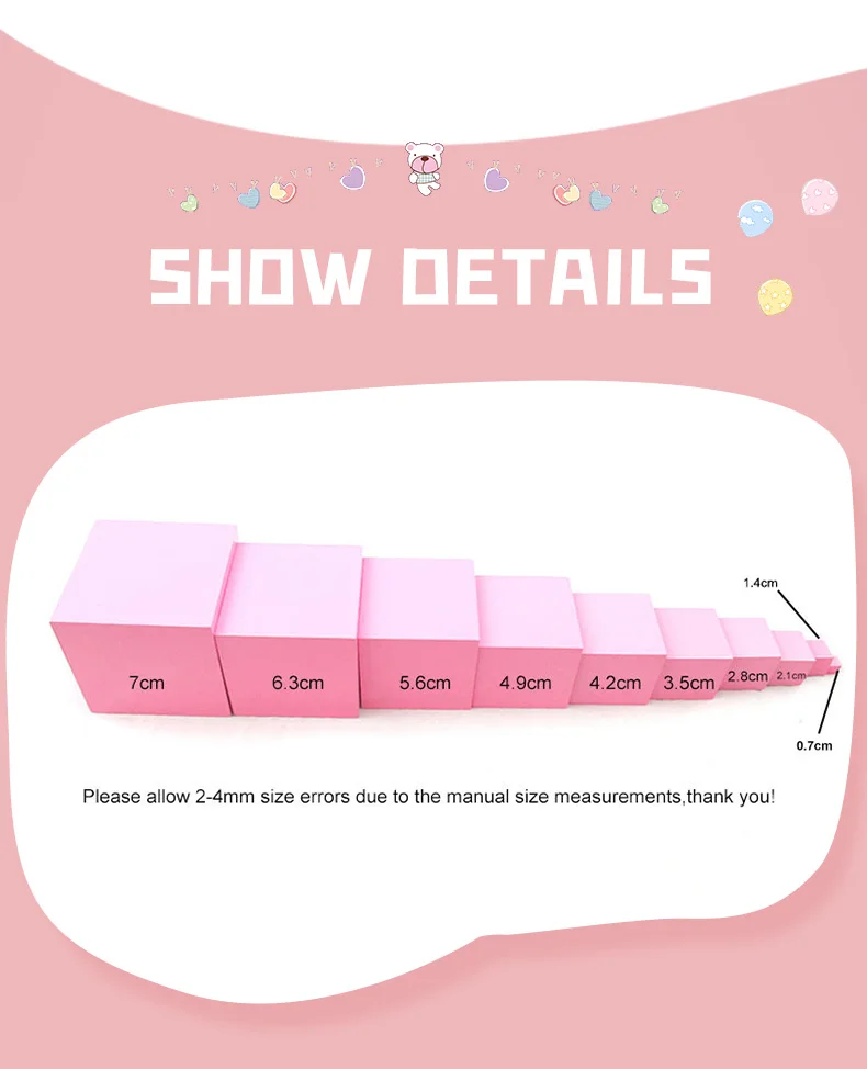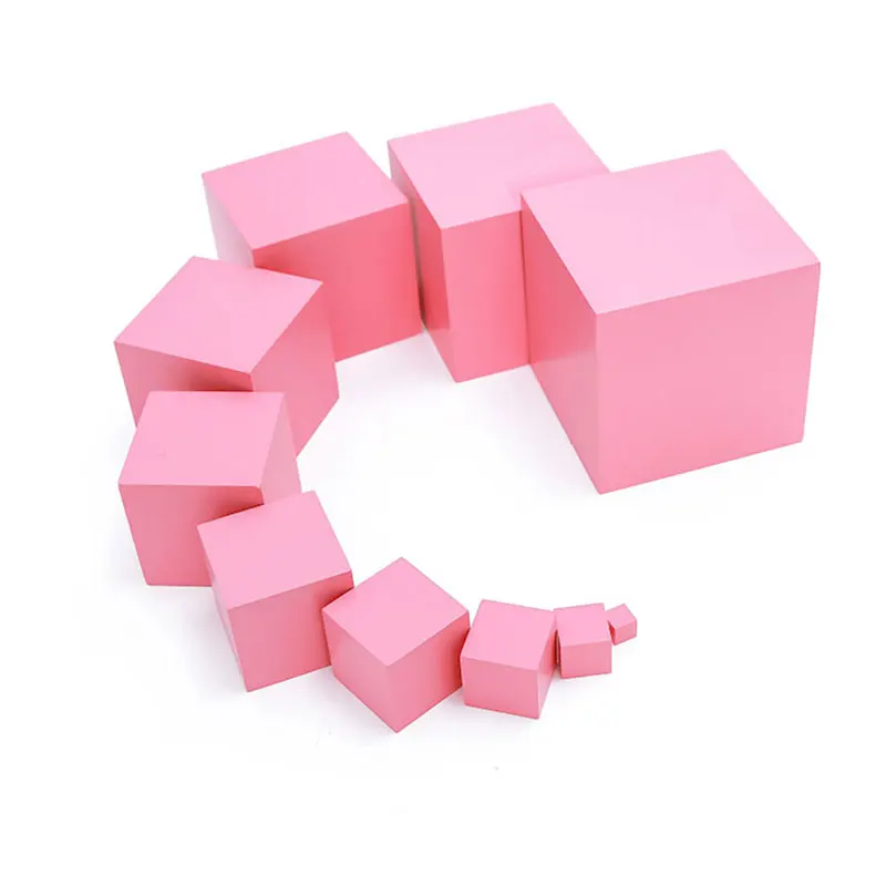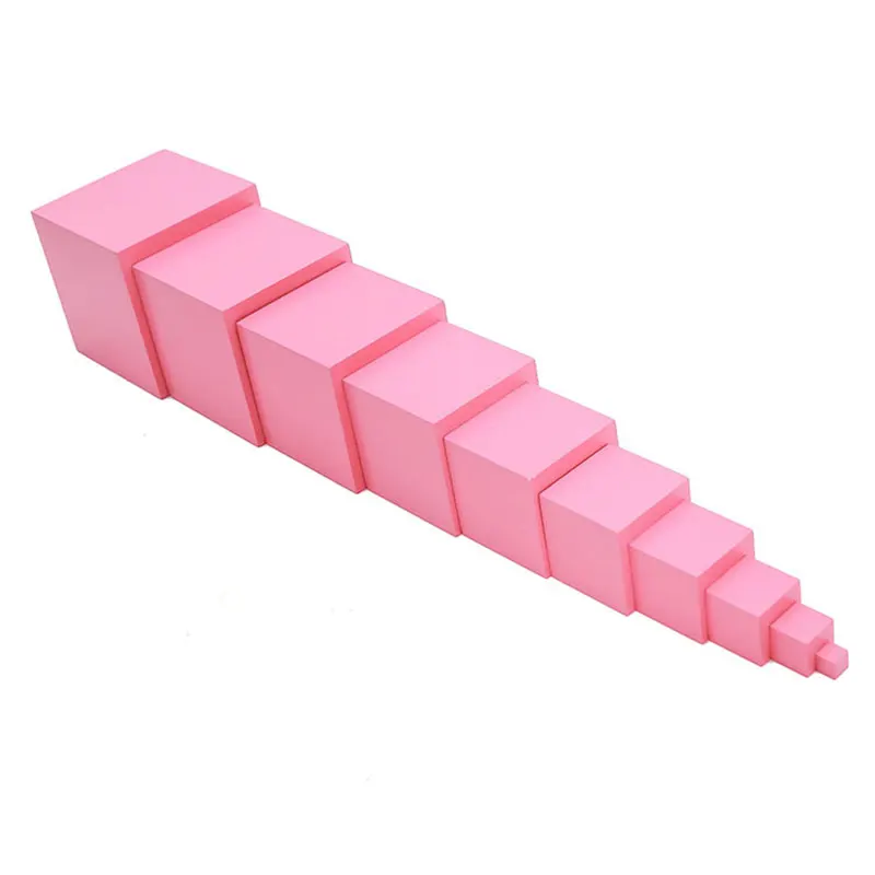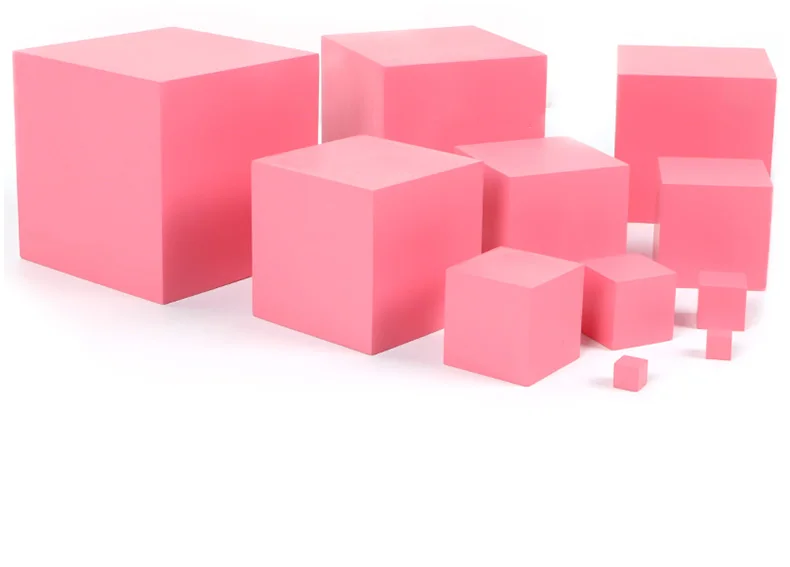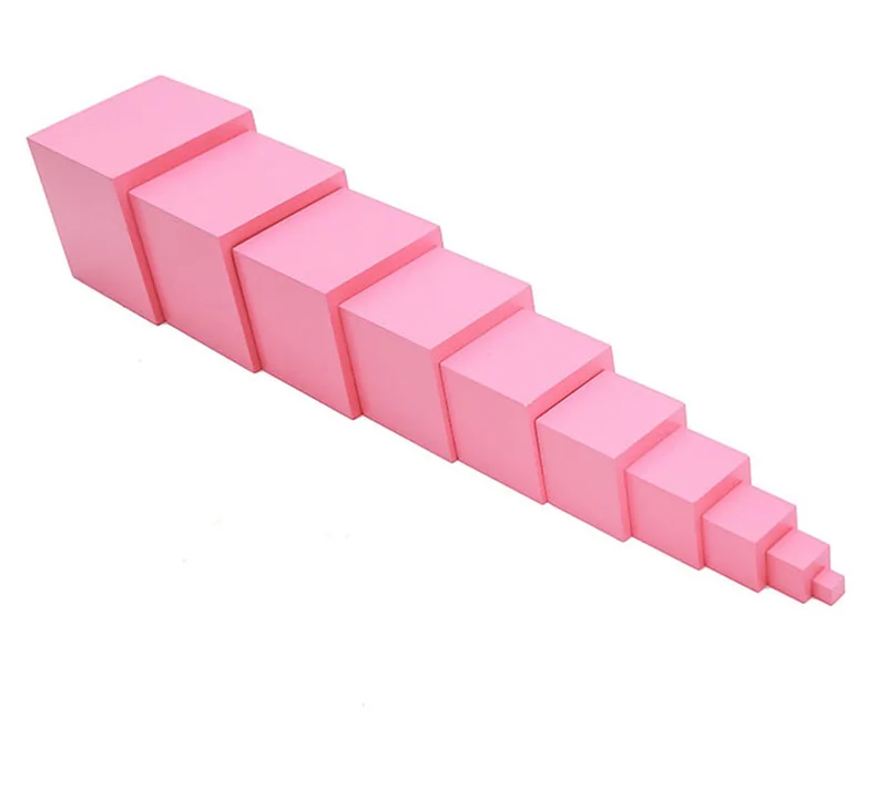 10 розовых деревянных кубиков, отличающихся 3 размерами. Кубики постепенно увеличиваются в алгебраической серии третьей мощности. Таким образом, второй куб равен 8 из первого; Третий куб равен 27 из первого и т. Д. Один цвет позволяет ребенку фокусироваться на цели деятельности, не отвлекаясь. Назначение Прямая поставка Визуальная изоляция размеров. Непрямой -Утонченность движения за счет размещения кубов одной сверху другой одним движением руки. Делая это движение, ребенок совершенствует зрительно-моторную координацию и должен концентрироваться. -Подготовка к математике.