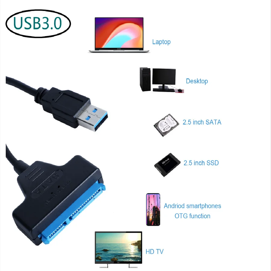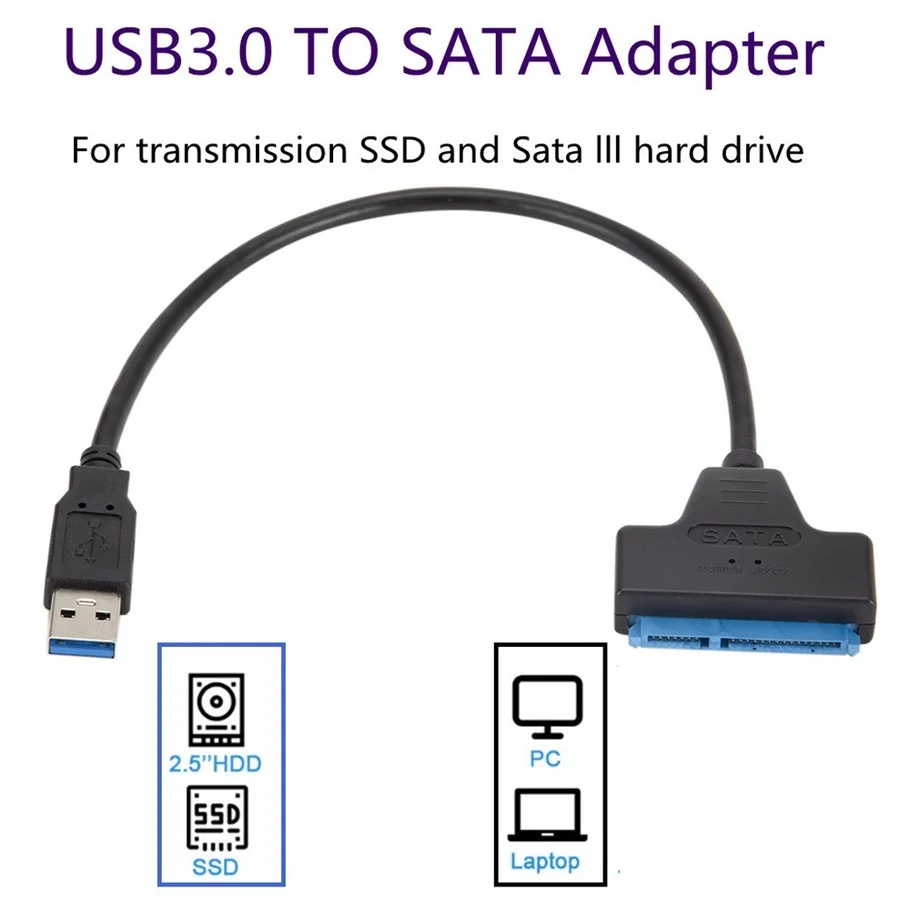 Характеристики:1.Adpter SATA III USB 3,0 кабель внешний жесткий диск USB к Serial ATA 22pin конвертер жесткий диск 6 Гбит/с для 2,5 "HDD/SSD.2. Данный USB 3,0 на SATA конвертер кабель соединяет с любыми стандартными 2,5 дюймов жесткий диск SATA или твердотельный накопитель (SSD) к компьютеру через USB 3,0 порта. Это идеально подходит для резервного копирования файлов или обновления жесткого драйвера ноутбука.3. Спецификация SATA 3 поддерживает скорость до 6 Гбит/с;4. Легкий и быстрый доступ к внешнему хранилищу;5. Светодиодный индикатор активности;6. Полностью совместим с USB 3,0 и обратно совместим с USB 2,0/1,1;7. Подключи и работай, горячая замена;8. Поддержка Windows 98/2000/XP/Vista/7/8, Mac OS X. Соответствует стандартам serial ATA2.0.Совместим с usb-портом (1,0, 1,1 и 2,0) и жестким диском SATA (1,5 ГБ/сек. и 3 ГБ/сек.).Файла USB2.0 независимых источника питания интерфейс, поддержка 2,5 "с высокой пропускной способностью памяти драйвер.Совместимость с ОС Windows 7 (32-бит/64-бит)/Vista (32-бит/64-бит)/Vista/XP (32-бит/64-бит)/server 2003 и 2008 (32-бит/64-бит) система Посылка включает в себя:1 х Sata кабель для 2,5 "SSD HDD(USB 2,0/3,0/3,1)