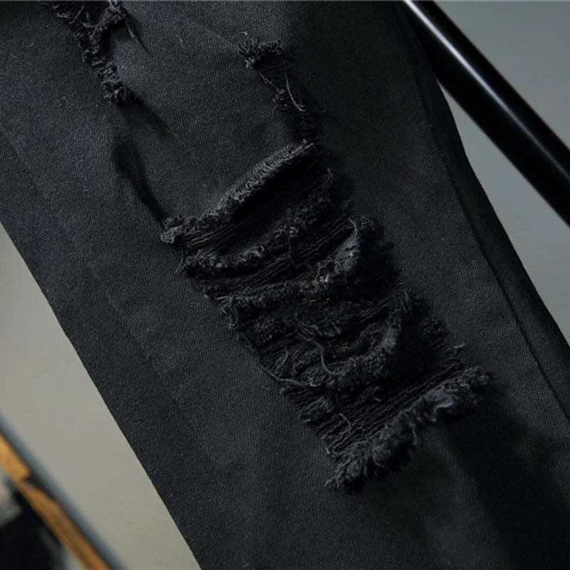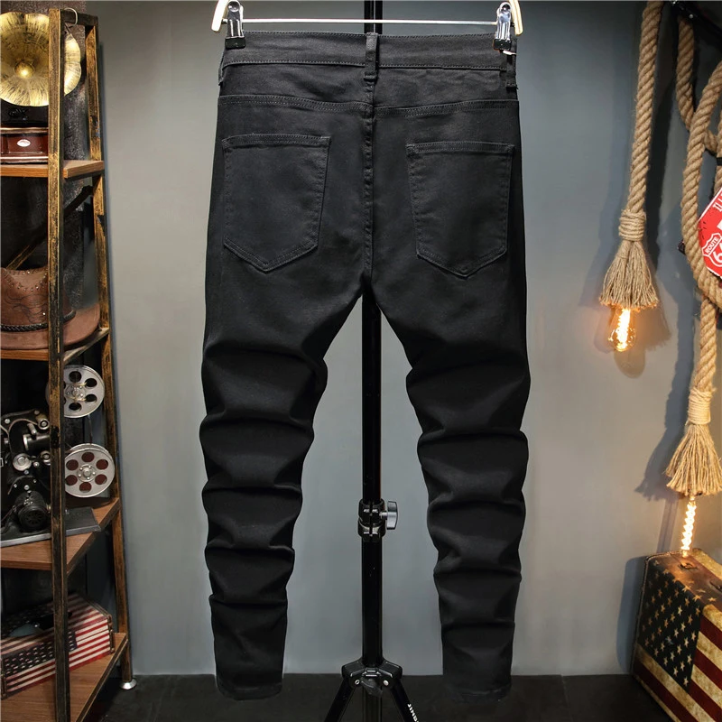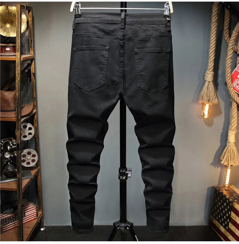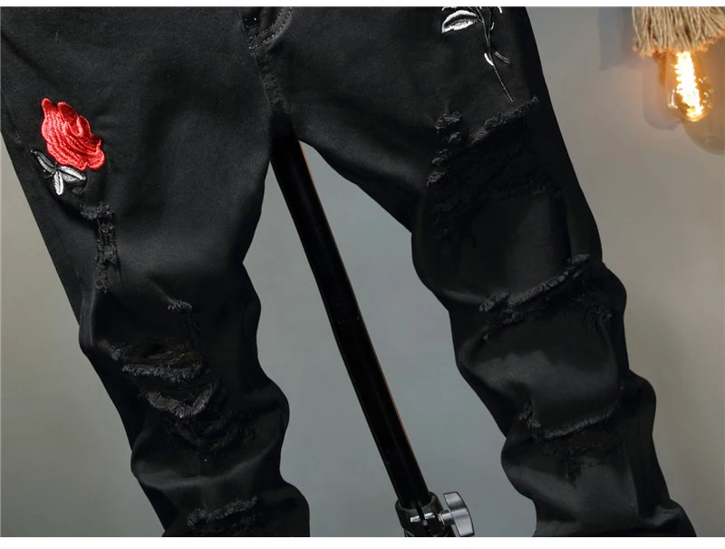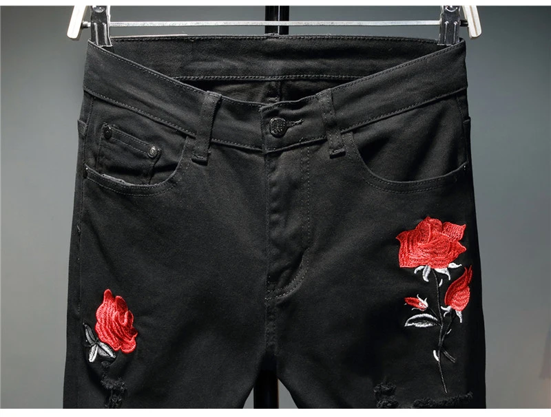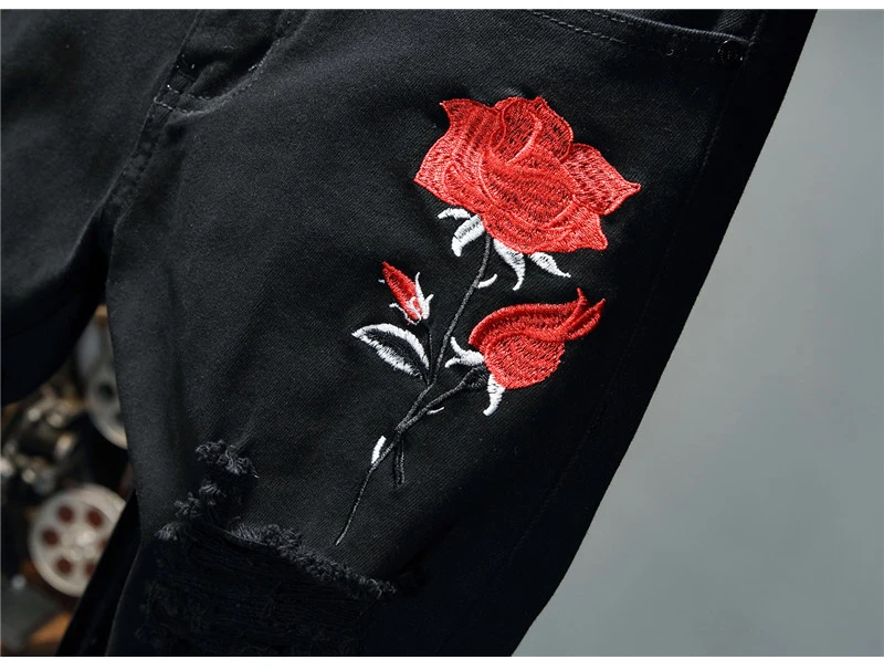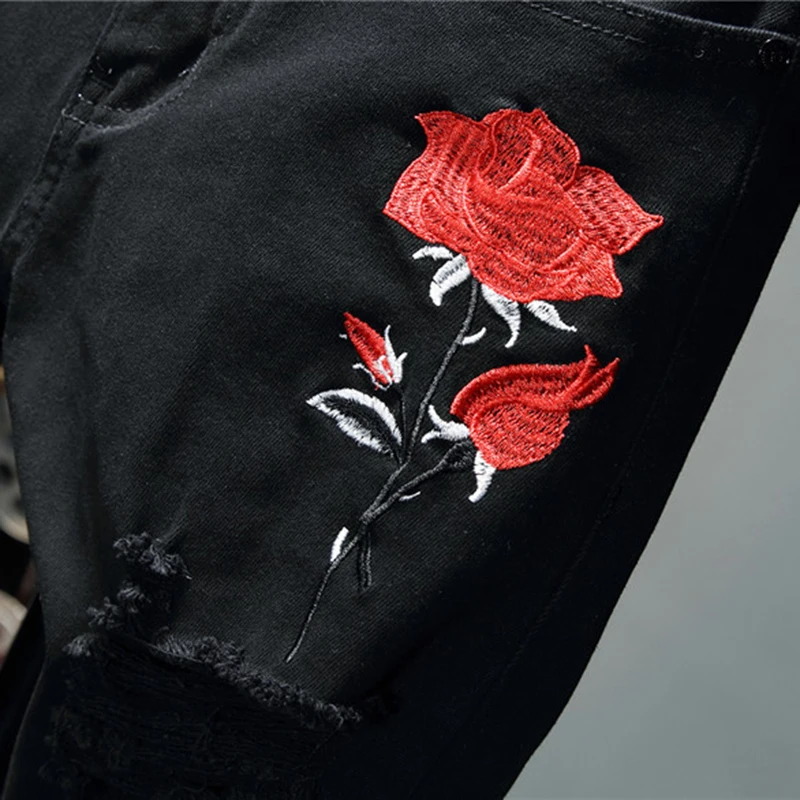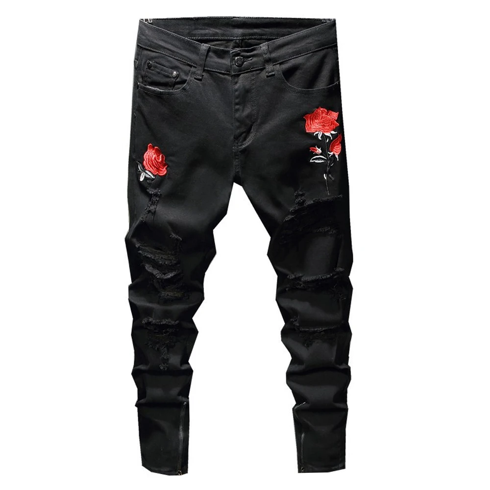 Мужские рваные джинсы с вышивкой розы, модные красные джинсы с цветочной вышивкой, узкие Стрейчевые брюки-карандаш