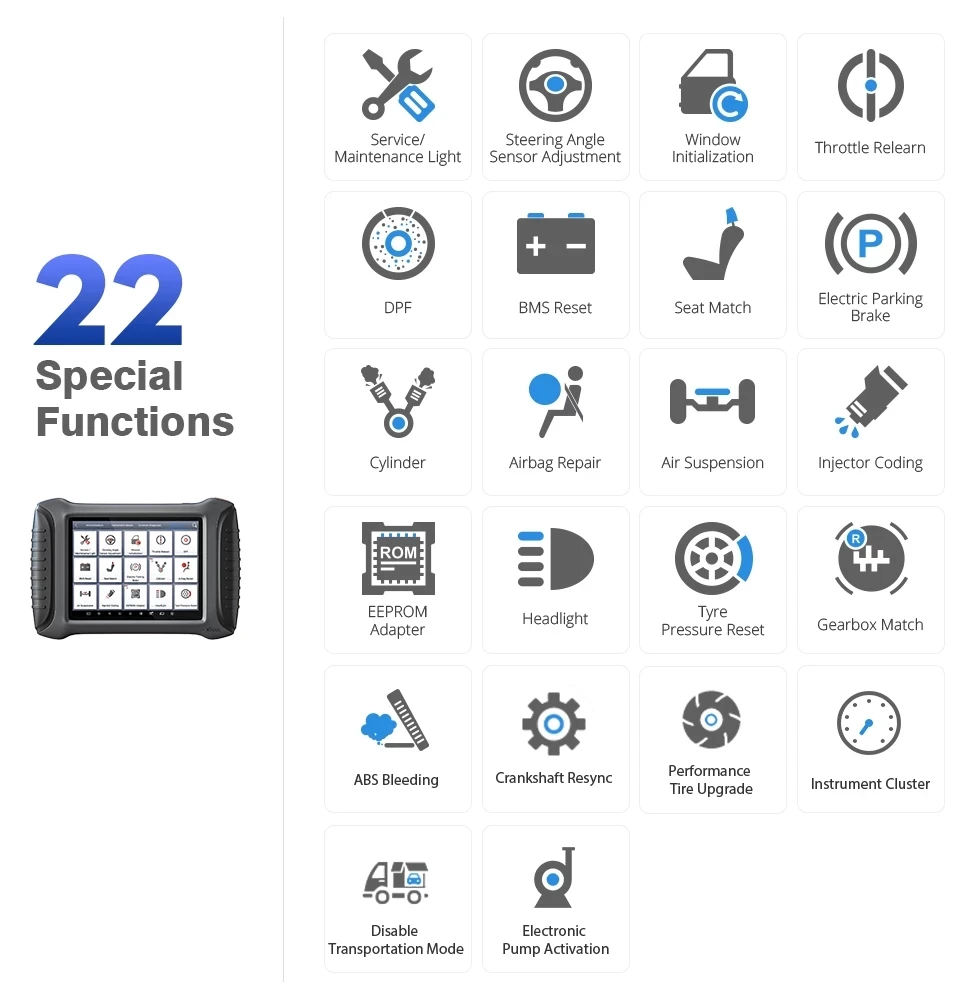 X100 PAD3 работает для всех функций диагностики систем, например: Двигатели / Автоматическая коробка передач / Подушки безопасности / Иммобилайзер / Кодирование ключей / АБС / Круиз-контроль / Приборы / Системы самовыравнивающейся подвески / Сиденья / Двери / Шлюз / Угол поворота / Пневматическая подвеска / Системы кузова / Электронный усилитель рулевого управления и вспомогательный двигатель / Усилитель рулевого управления / Давление в шинах / Датчики дождя / Система полного привода / Стабилизатор / Интеллектуальная система помощи при парковке / Дверные двигатели / Аудиосистемы / Кондиционер / Типтроник / Противоугонная система / Мягкий верх / Регулировка высоты фар / Центральный замок / Автоматическое сцепление / Сброс DPF / Электрические стеклоподъемники / Программирование Plip / Заднее стекло с подогревом / Ксеноновые фары / Протирочная система / Подогреватель топлива / Раздаточная коробка / Память сиденья / Сброс срока службы масла / Раздвижные двери / Электронный дроссель / Система навигации / Датчик опрокидывания / Круиз-контроль / Многофункциональное рулевое колесо / дополнительный обогрев / электронный стояночный тормоз / электроника сцепления и т. Д.