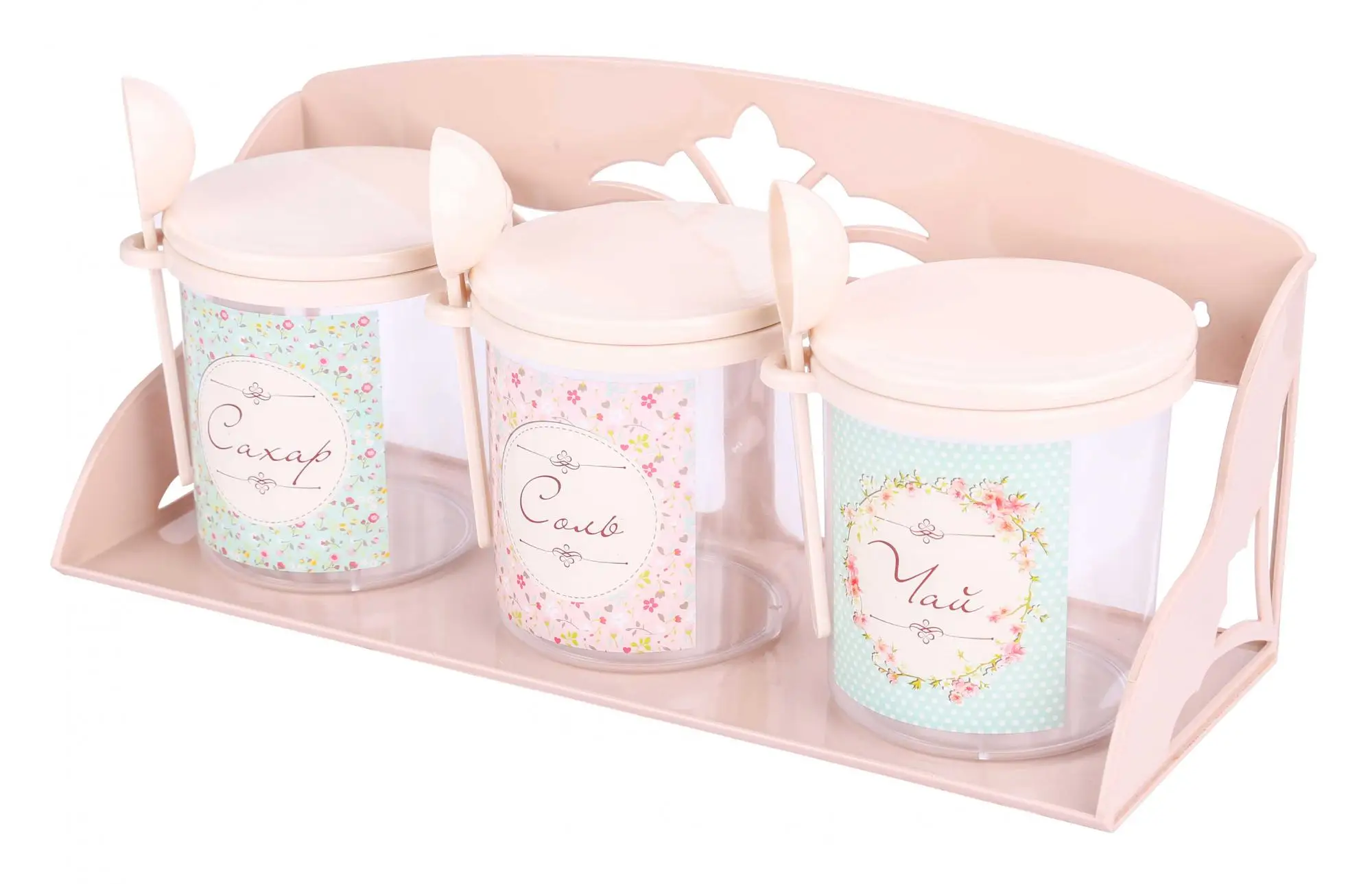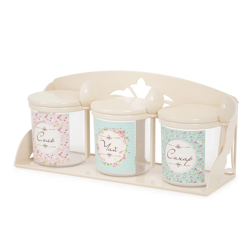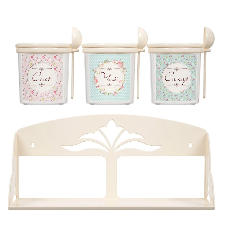 Набор емкостей на полке решает проблему рационального размещения самых необходимых продуктов. Изделия предназначены для хранения различных сыпучих продуктов: чая, соли, сахара, кофе. Прозрачность ёмкости позволяет видеть содержимое, а тематическая наклейка на ней - соблюдать порядок размещения продуктов на кухне. Крышка плотно закрывает банку и надежно защищает продукты от влаги и мусора. На специальном ободке крепится мерная ложка для удобства использования. Изделия изготовлены из качественного пластика, безопасного для здоровья человека.