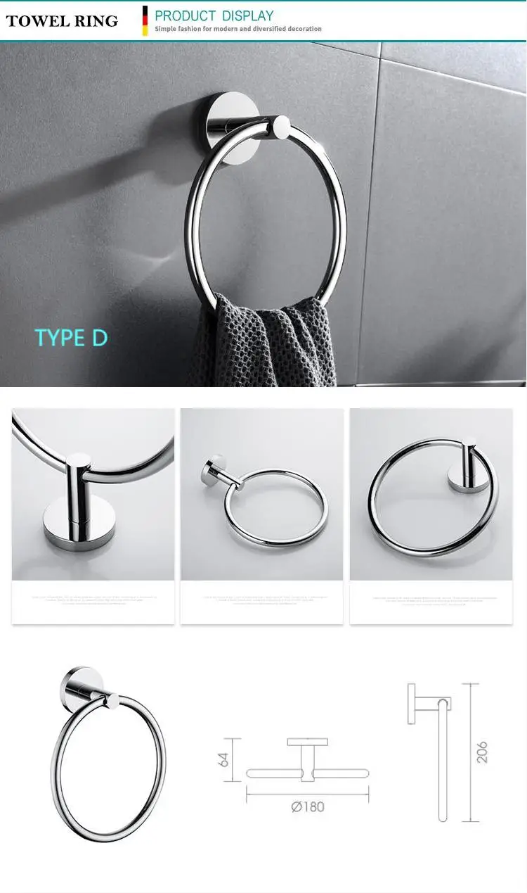 Особенности и характеристики:Аксессуары для ванной комнатыКольцо для полотенецМатериал: Прочная нержавеющая сталь SUS 304/цинк/латуньИспользование: ванная комната/туалет/кухняОтделка: высококачественное хромированное покрытие и матовое черное покрытиеТип: аксессуары для ванной комнатыУстановка: НастенныйВключая все монтажные фитинги