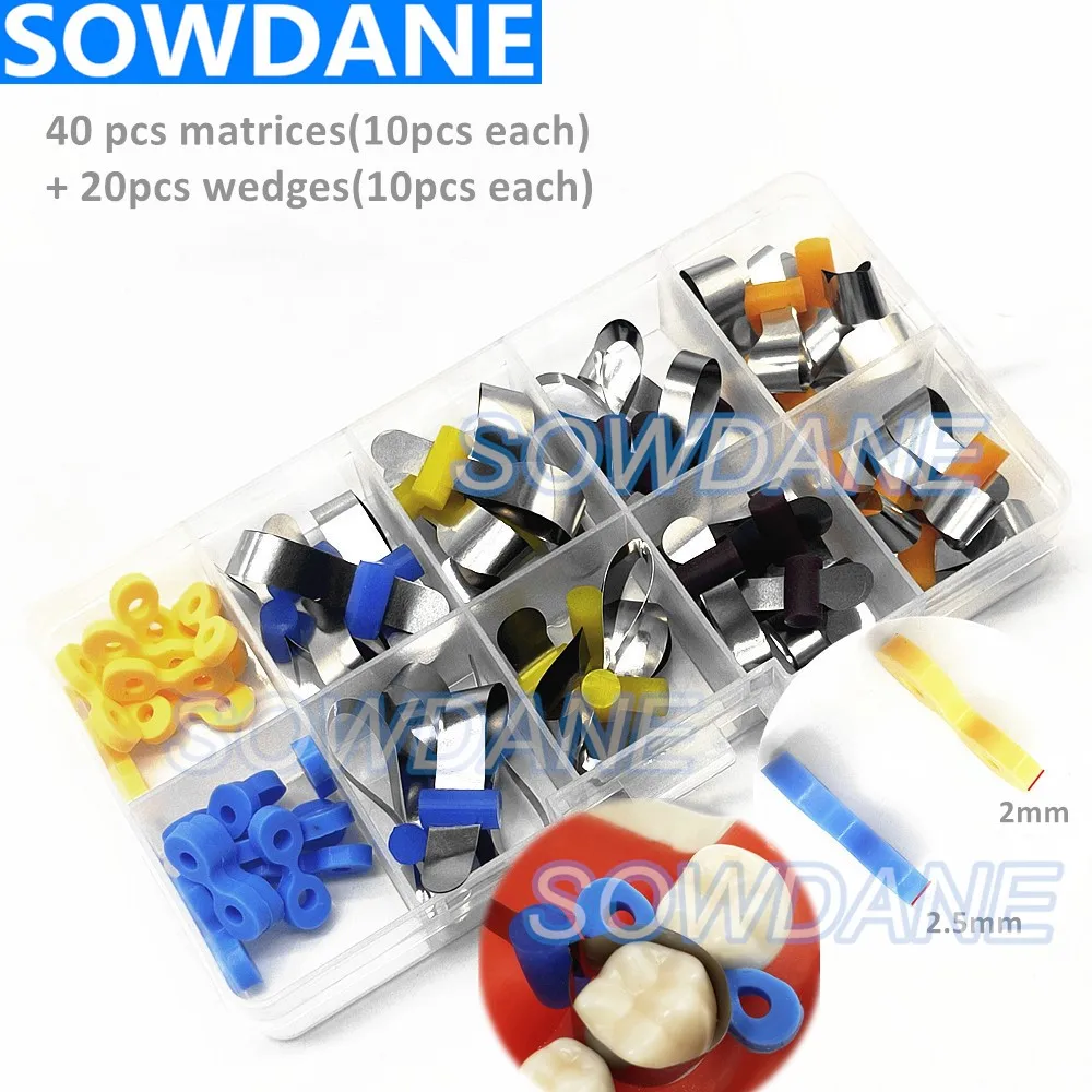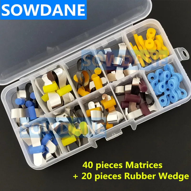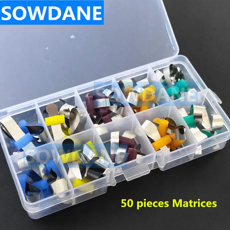 --- Упаковка: 1 коробка, включая 50 металлических матричных полос (10 шт. каждого цвета) или 1 коробку, включая 40 металлических матричных полос с 20 резиновыми клиньями