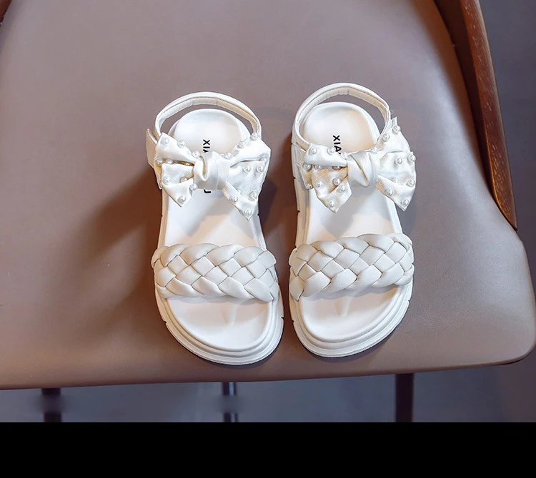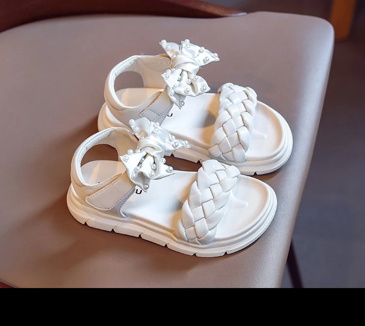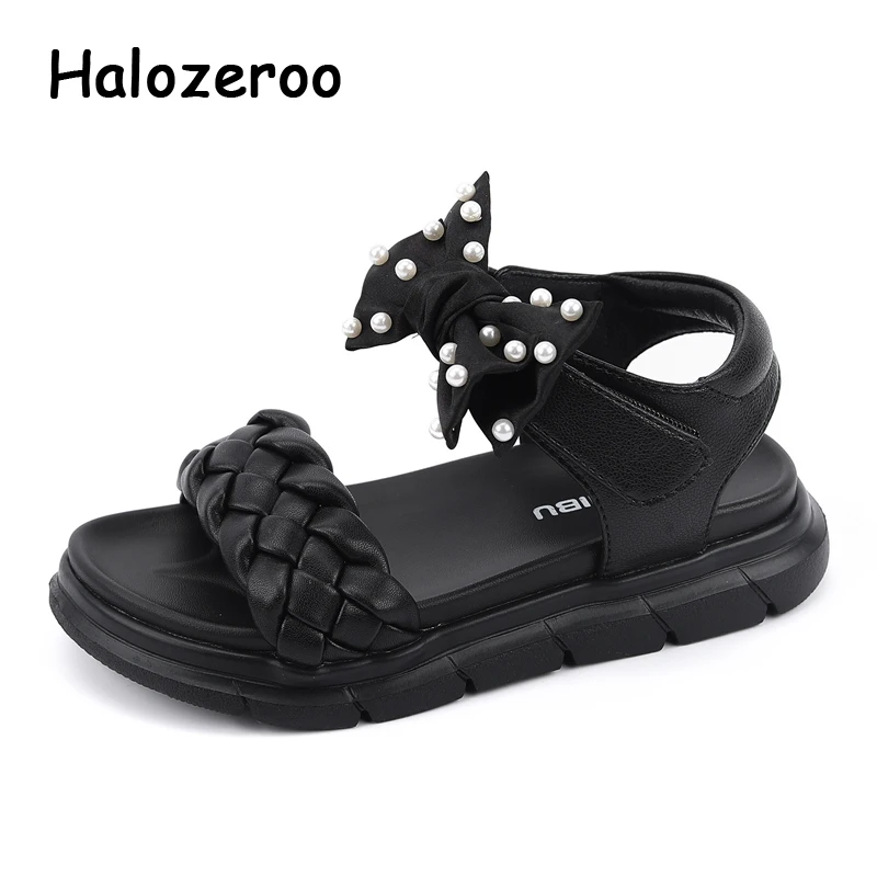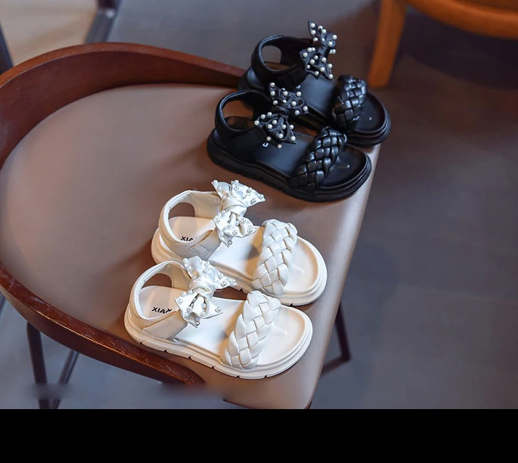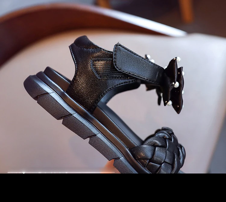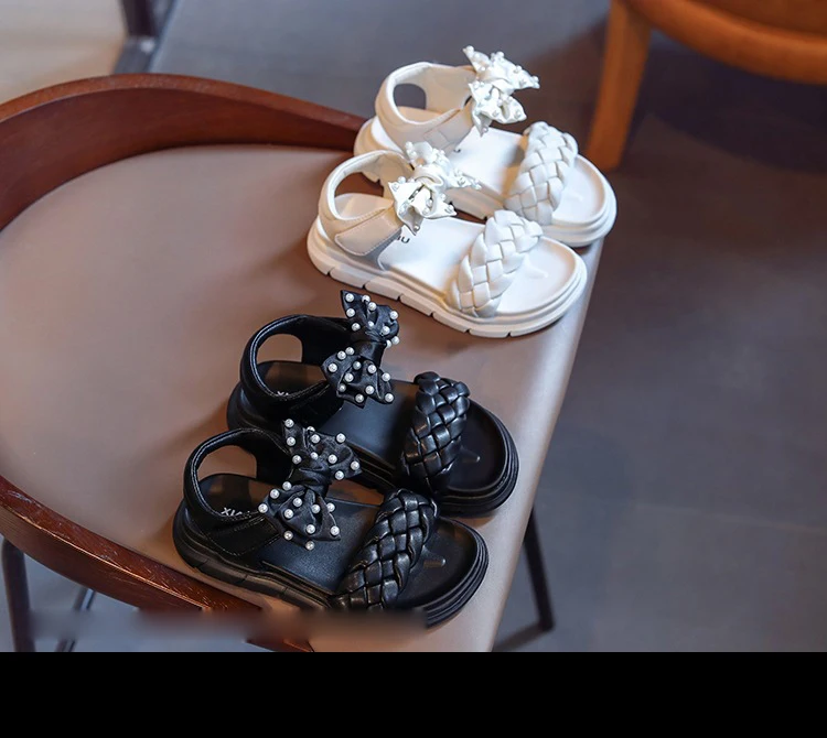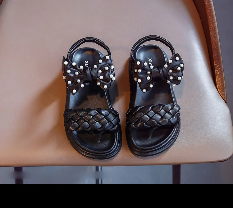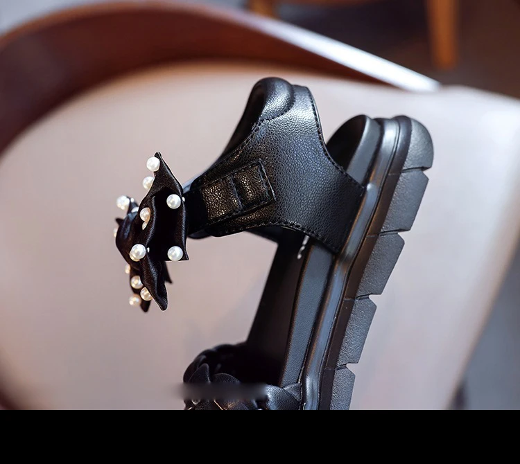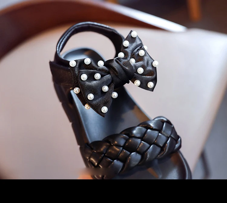 Летние детские сандалии принцессы с бантом, детская брендовая обувь с жемчугом, черные пляжные сандалии для маленьких девочек, кожаные модельные туфли, модные сандалии