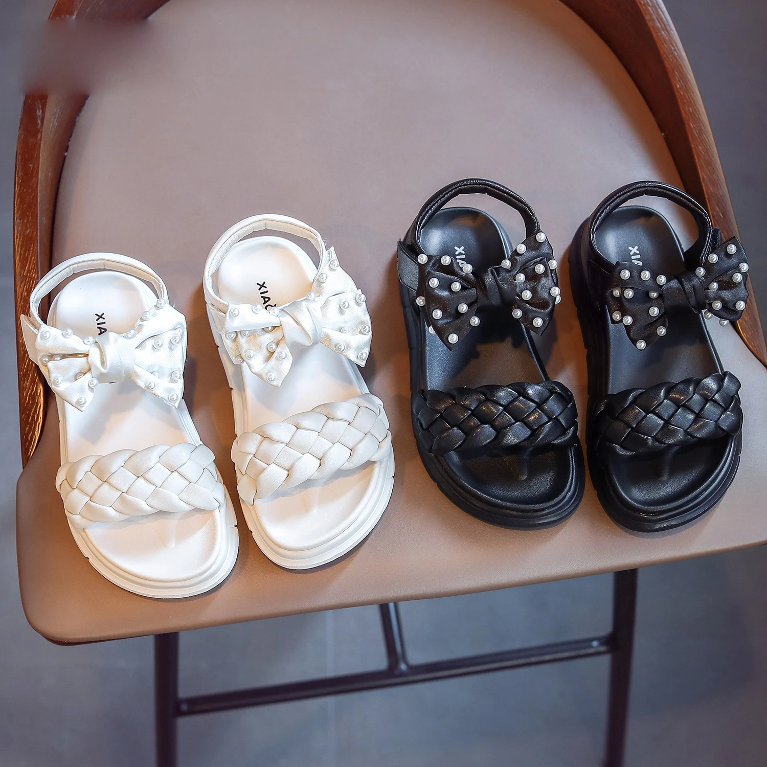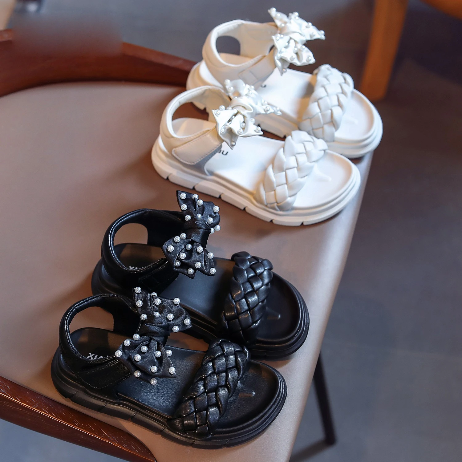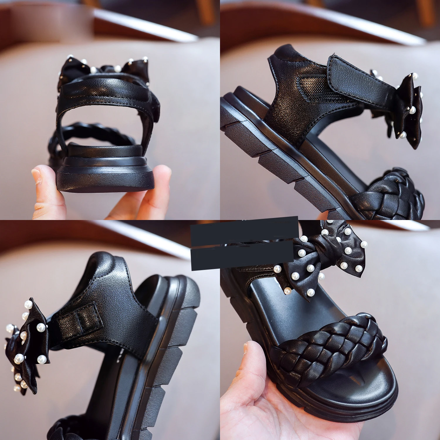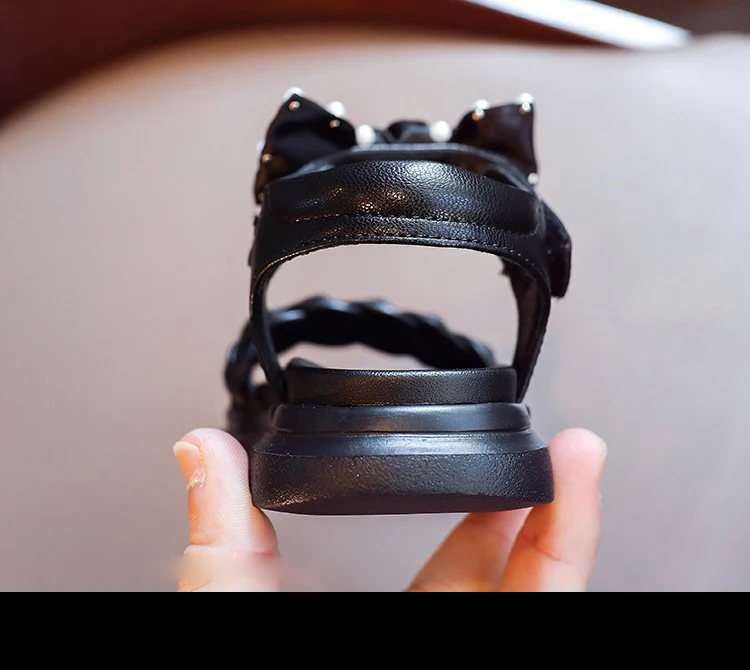 Сандалии Детские, с жемчугом и бантом, черные, летние