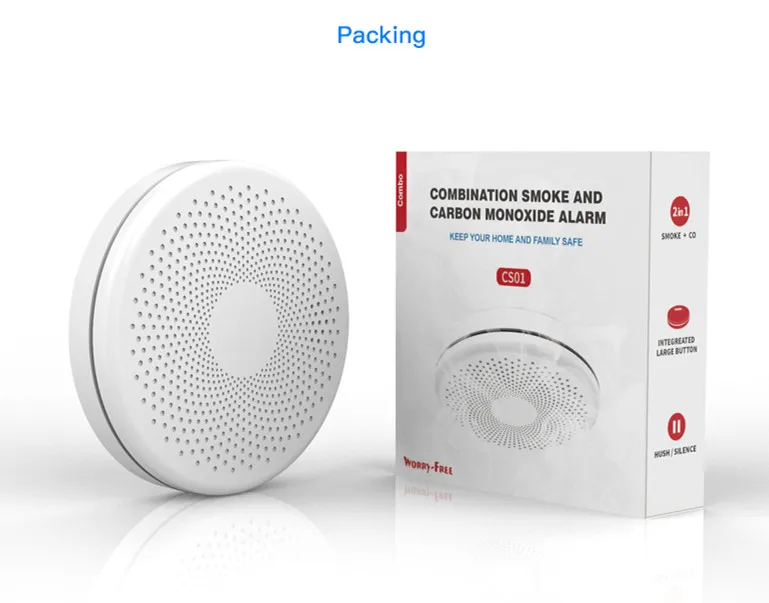 1,2 в 1 окись углерода + детектор дыма 2. Высоконадежный электрохимический датчик и инфракрасный фотоэлектрический датчик 3. Светодиодный жидкокристаллический дисплей 4. Содержание окиси углерода при обнаружении газа: 000-999ppm 5. Чувствительность дыма: 0.1% дБ/m-9.9 % дБ/м 6. Мощность: 3 батареи AA1.5V (не входят в комплект) 7. Низкое потребление тока, длительный срок службы в режиме ожидания 8. Подсказка низкого заряда батареи 9. Функция памяти сигнализации 10. Пауза тревоги (бесшумный режим) 11. Двойное предупреждение: звуковой сигнал и светильник/светодиодный индикатор 12. Звуковая сигнализация:>100 дБ 13.SMT промышленное производство, сильная стабильность 14. Размер: 104 мм (диаметр) * 35 мм (высота) 15. Материал: пластик 16. Цвет: белый 17. Область защиты детектора дыма: когда высота пространства составляет от 6 до 12 метров, площадь защиты одного детектора составляет 80 квадратных метров для общей площадки защиты; когда высота пространства составляет 6 метров или меньше, площадь защиты составляет 60 квадратных метров. 18. Область применения: барбекю магазин, кухня, спальня, гостиная, парковка, школа, библиотека и т. Д.