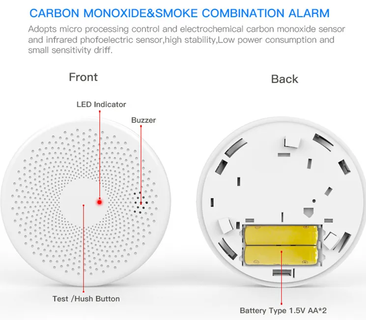 Этот продукт представляет собой умный Комбинированный Детектор окиси углерода и дыма, принимающий Микропроцессорный контроль. Электрохимический углерод Датчик окиси является стабильным и надежным с низким потреблением тока и небольшой чувствительностью дрейфа. В основном хорошо используется в месте углерода Угарный газ утечки и место огня, хорошо гарантия личной безопасности. Питается изделие byReplaceable 1,5 V AA * 2 батареи. Когда детектор дает сигнал тревоги, он излучает звуковой сигнал> 85 дБ, И светильник сигнализации будет мигать одновременно. Детектор имеет функцию будильника низкого напряжения и функцию отключения звука или тестирования кнопки. Детектор использует технологию низкой мощности