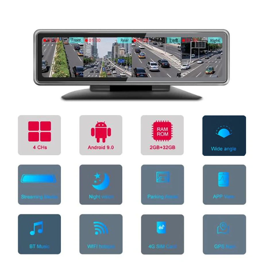 1. 12 дюймовый сенсорный экран2. 4 камеры записи одновременно (передняя + задняя + правая + левая камера записи), ночное видение3. Угол обзора 360 градусов4. android 9,0 2 + 32G для хранения5. Поддержка gps-навигации6. Встроен в google play market7. Поддержка функции fm-передатчика8. Прямой WIFI и функция BT9. 24H монитор парковки10. Поддержка Интернет-диапазонов 4G, как показано ниже:2G GSM B5/B3/B8;3G WCDMA B1/B5/B8;4G TDD-LTE B38/B39/B40/B41;4G FDD-LTE B1/B3/B5/B811. Функция мобильного удаленного монитора12. Поддержка внутренней связи13. Поддержка потокового видео в режиме реального времени на телефоне14. Поддержка воспроизведения истории отслеживания GPS15. Платформа для отслеживания cmsv616. Запись видео и изображений через приложение17. Название приложения: автопомощь18. Поддержка двух способов установки* Основание центральной консоли* Специальное крепление для замены оригинального зеркала