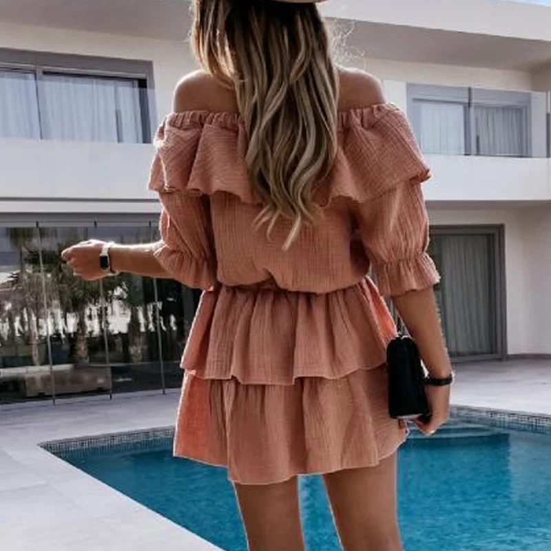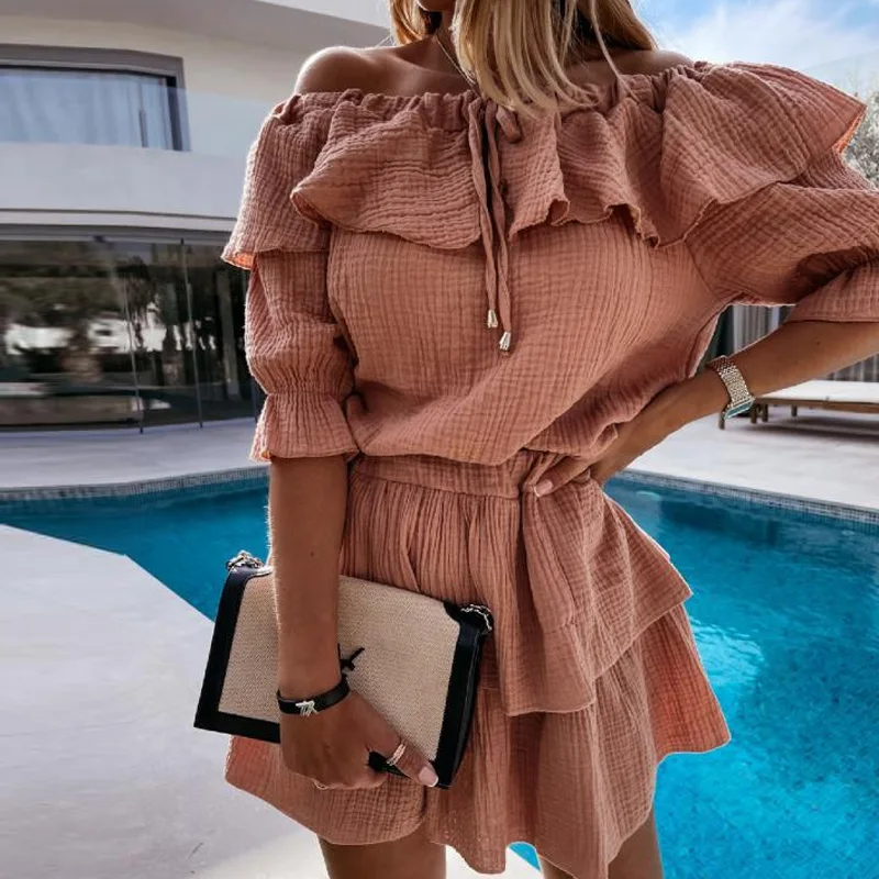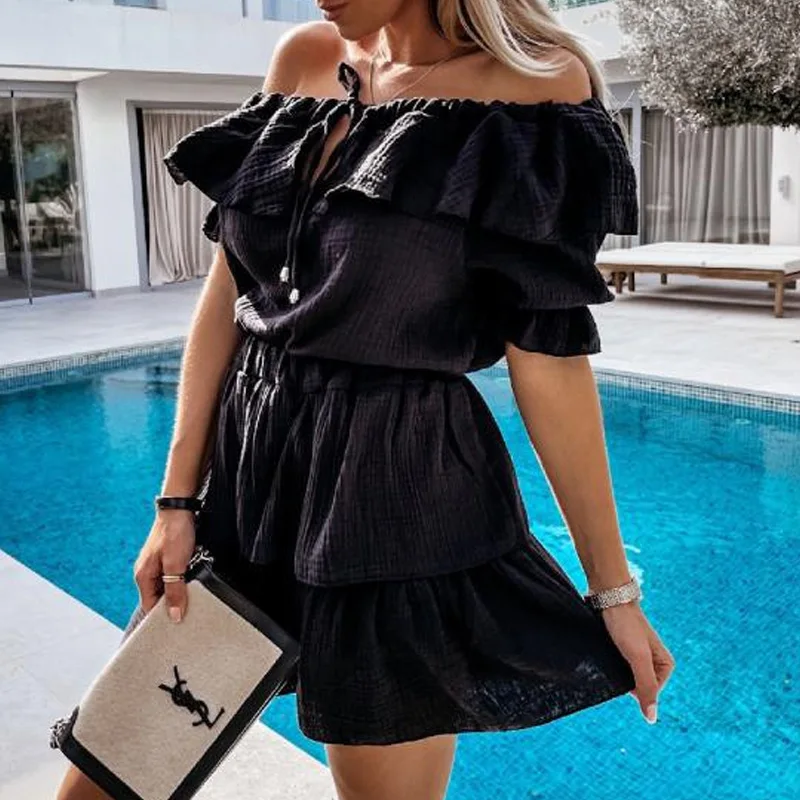 Платье женское с V-образным вырезом, модное элегантное пикантное вечернее, с открытыми плечами, с оборками, на шнуровке, повседневное, Пляжное с коротким рукавом, на лето